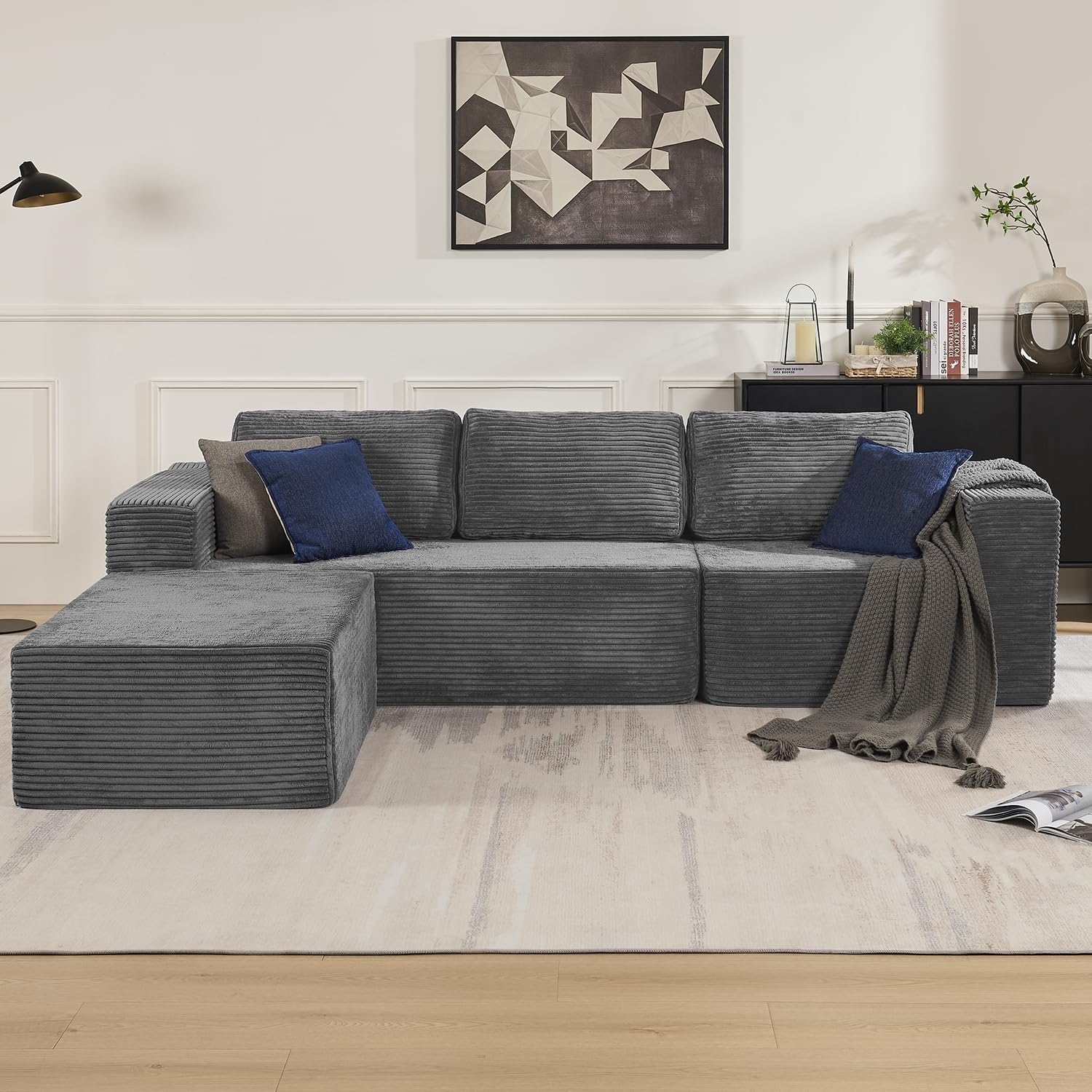 This sectional sofa is thoughtfully designed for everyday living, blending practicality with premium comfort. Its deep seating makes it ideal for curling up with a book, enjoying movie nights, or creating a cozy reading corner. The modular chaise adds versatility—flip it to the left if your coffee table blocks the right side, or reposition it based on seasonal decor changes. The neutral grey corduroy fabric complements a wide range of interior styles, from contemporary to rustic, while its textured surface naturally hides minor spills and pet hair, reducing maintenance concerns.