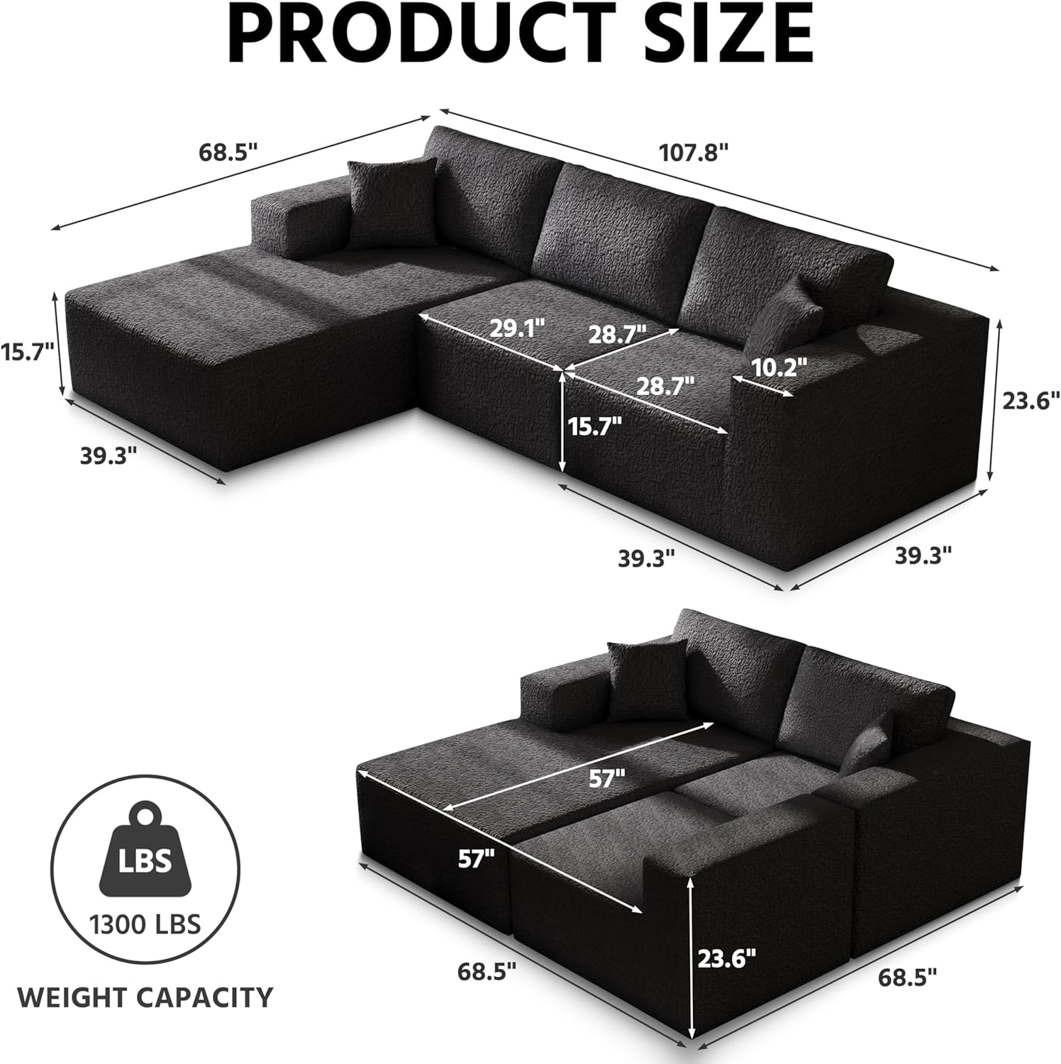 108″ Cloud Modular Sectional Couch with L-Shape Chaise,
