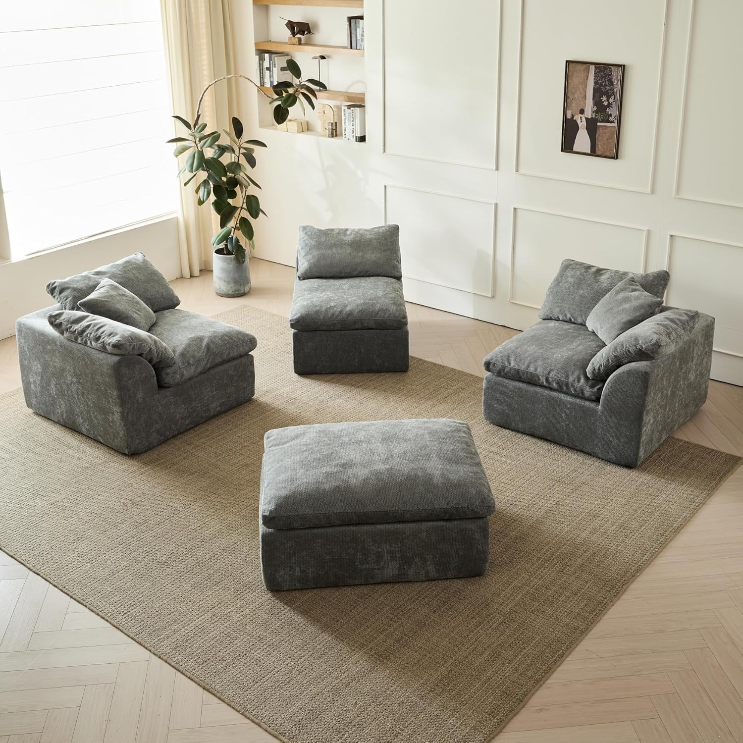 This luxurious 109″ modern cloud couch redefines comfort and style for your living room with its expansive seating, deep cushions, and contemporary modular design. Engineered for relaxation, this oversized 3-seater sectional features a boneless construction that enhances both visual appeal and structural integrity. The included ottoman adds versatility, transforming the sofa into a perfect lounging station ideal for unwinding after a long day or entertaining guests. Crafted from premium chenille fabric in a sophisticated dark grey hue, this sofa blends durability with a plush feel, making it a standout centerpiece for open-concept homes, apartments, or family rooms seeking modern elegance.