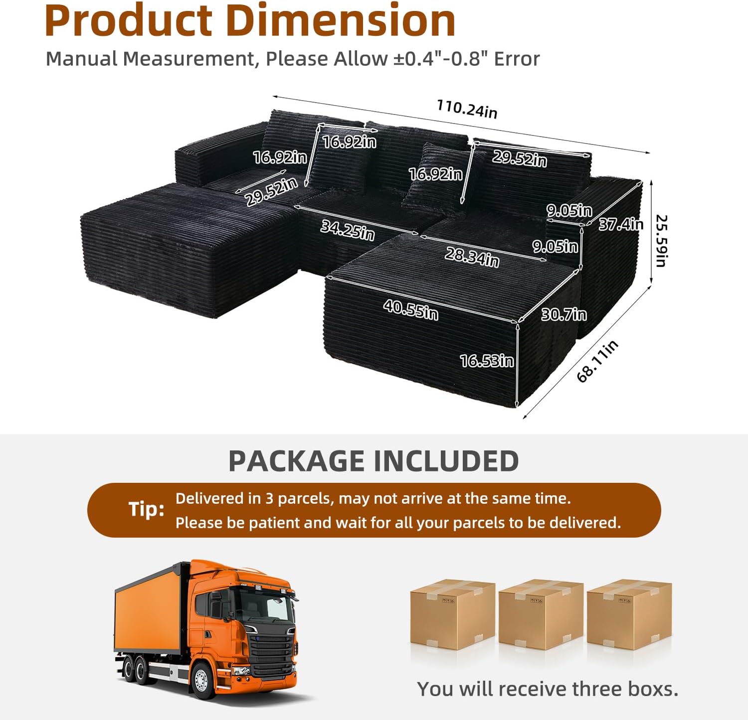This 110″ U-shaped modular sectional couch is engineered for those who value both luxurious comfort and practical design. Featuring a spacious three-seater configuration paired with two independently movable ottomans, the sofa delivers exceptional flexibility for any living space. The innovative boneless cloud construction eliminates traditional wooden frames beneath the cushions, creating a uniquely soft and supportive seating experience that molds gently to your body. Crafted from premium black corduroy fabric, this couch offers not only an elegant, rich texture but also long-lasting durability. Best of all, it arrives fully assembled—no tools, instructions, or assembly time required. Whether you’re hosting movie nights, relaxing after a long day, or simply seeking a stylish centerpiece for your living room, this sectional meets modern comfort standards with ease.