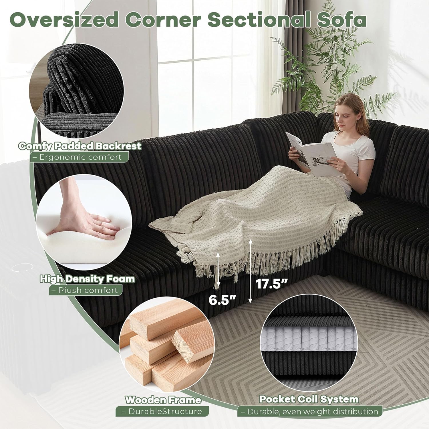 This 110″ oversized L-shaped sectional sofa redefines modern living room comfort with its spacious design and thoughtful functionality. Crafted from soft, durable corduroy fabric, the modular corner couch offers both plush seating and lasting style, making it ideal for families, movie nights, or entertaining guests. Its generous dimensions provide ample room for relaxation, while the L-shape configuration fits snugly into corners or open spaces, maximizing utility without sacrificing aesthetics. Whether you’re unwinding after a long day or hosting friends, this couch combines everyday practicality with contemporary elegance.