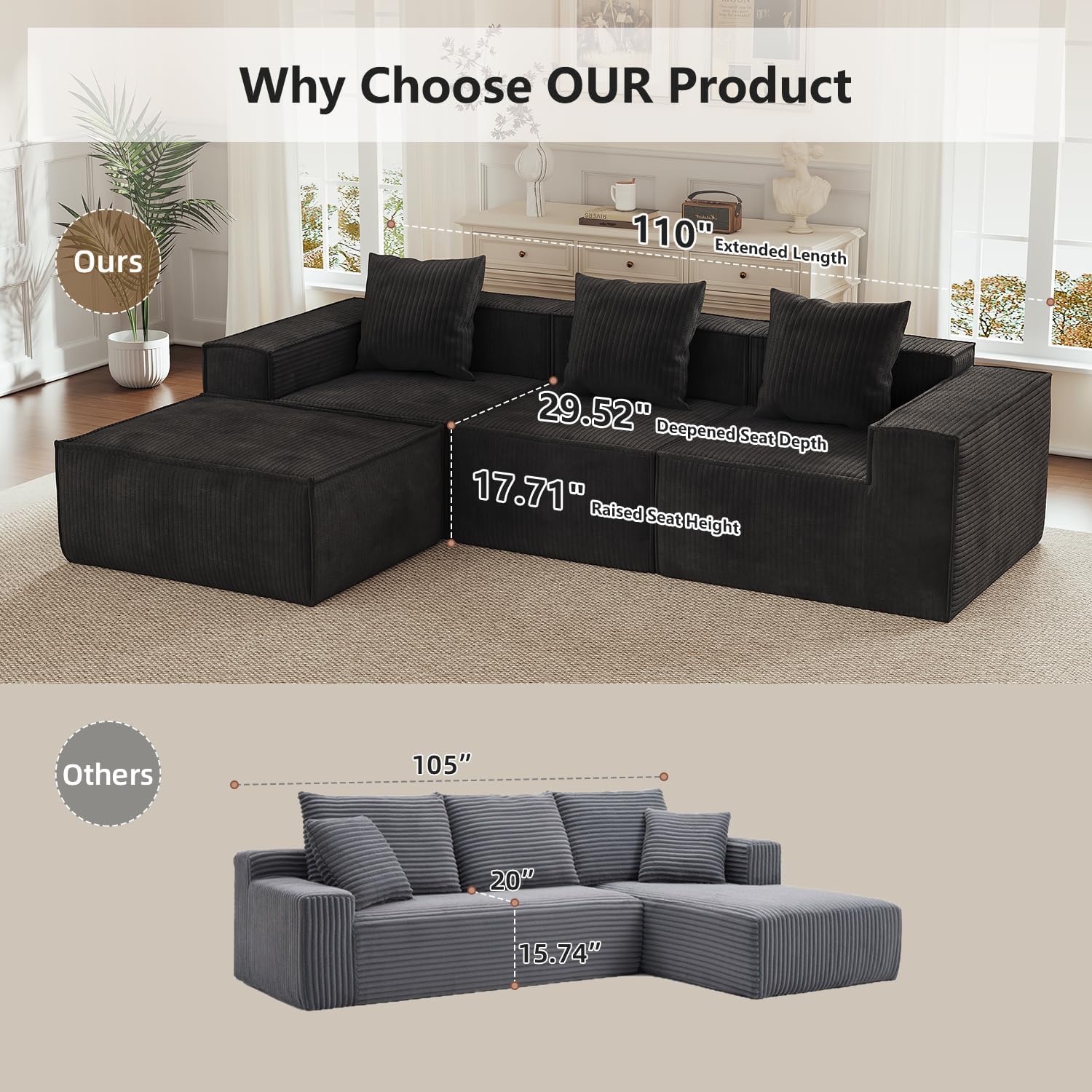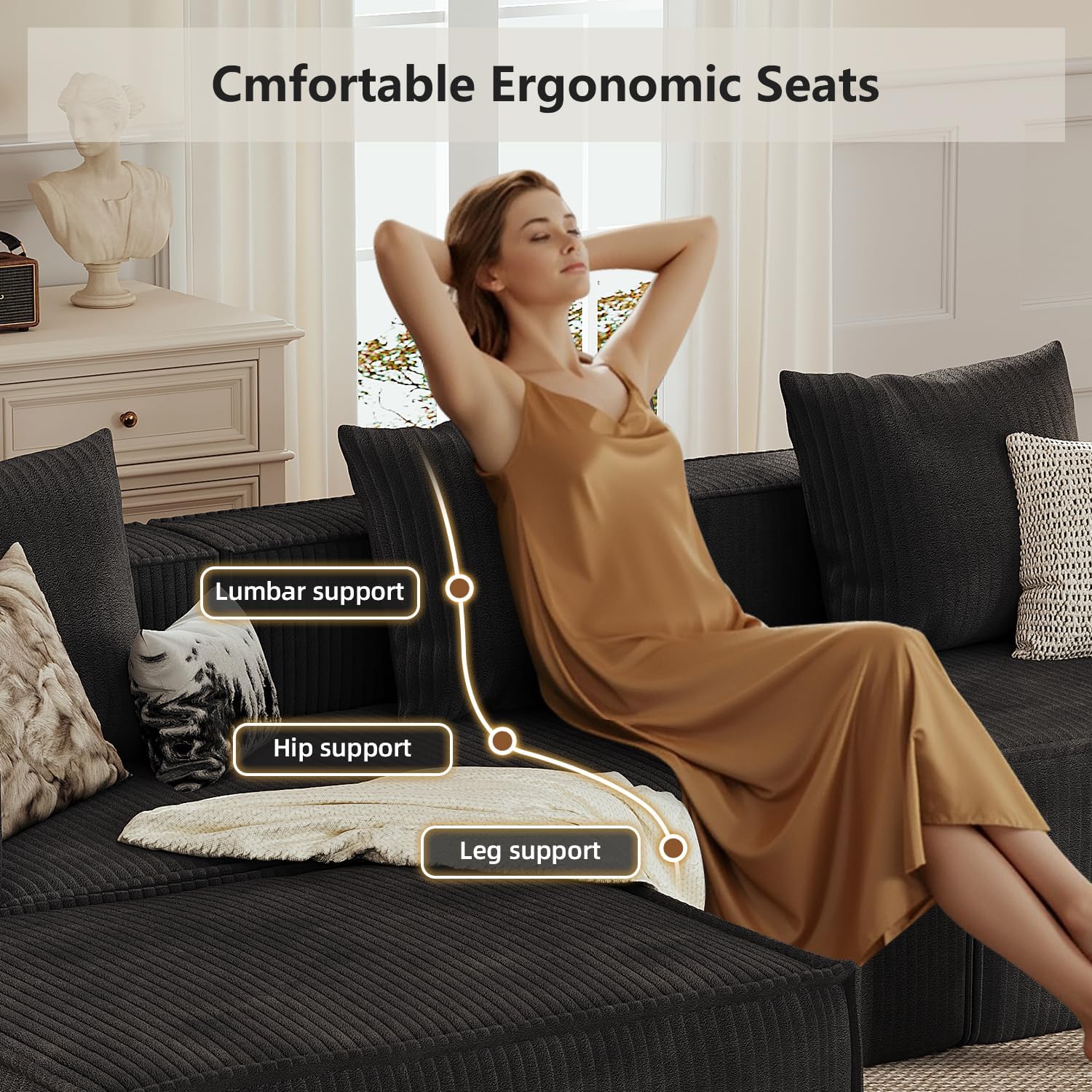 This 110” modular sectional couch combines plush comfort with thoughtful design, making it an ideal centerpiece for living rooms, bedrooms, or multi-functional spaces. Crafted from soft grey corduroy fabric, it offers a luxurious feel that invites relaxation while maintaining durability for everyday use. The modular construction allows you to freely rearrange the pieces to suit your space and lifestyle—whether you need an L-shaped lounge, a compact daybed, or a flexible seating arrangement for guests. With its boneless sectional design, this sofa eliminates rigid frameworks, providing a modern, fluid aesthetic and enhanced adaptability.