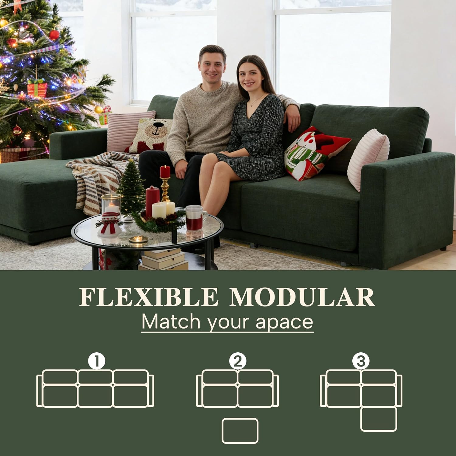 This 112″ modular sectional couch offers a versatile and stylish seating solution tailored for modern living rooms. Designed as part of a four-piece chenille sofa set, it combines comfort, flexibility, and contemporary aesthetics to adapt seamlessly to your home’s layout and evolving needs. The included ottoman enhances both functionality and visual appeal, making this set ideal for casual lounging, entertaining guests, or creating a cozy family space. With its deep dark green fabric, the sofa brings sophistication and warmth to any décor while maintaining durability and ease of maintenance.