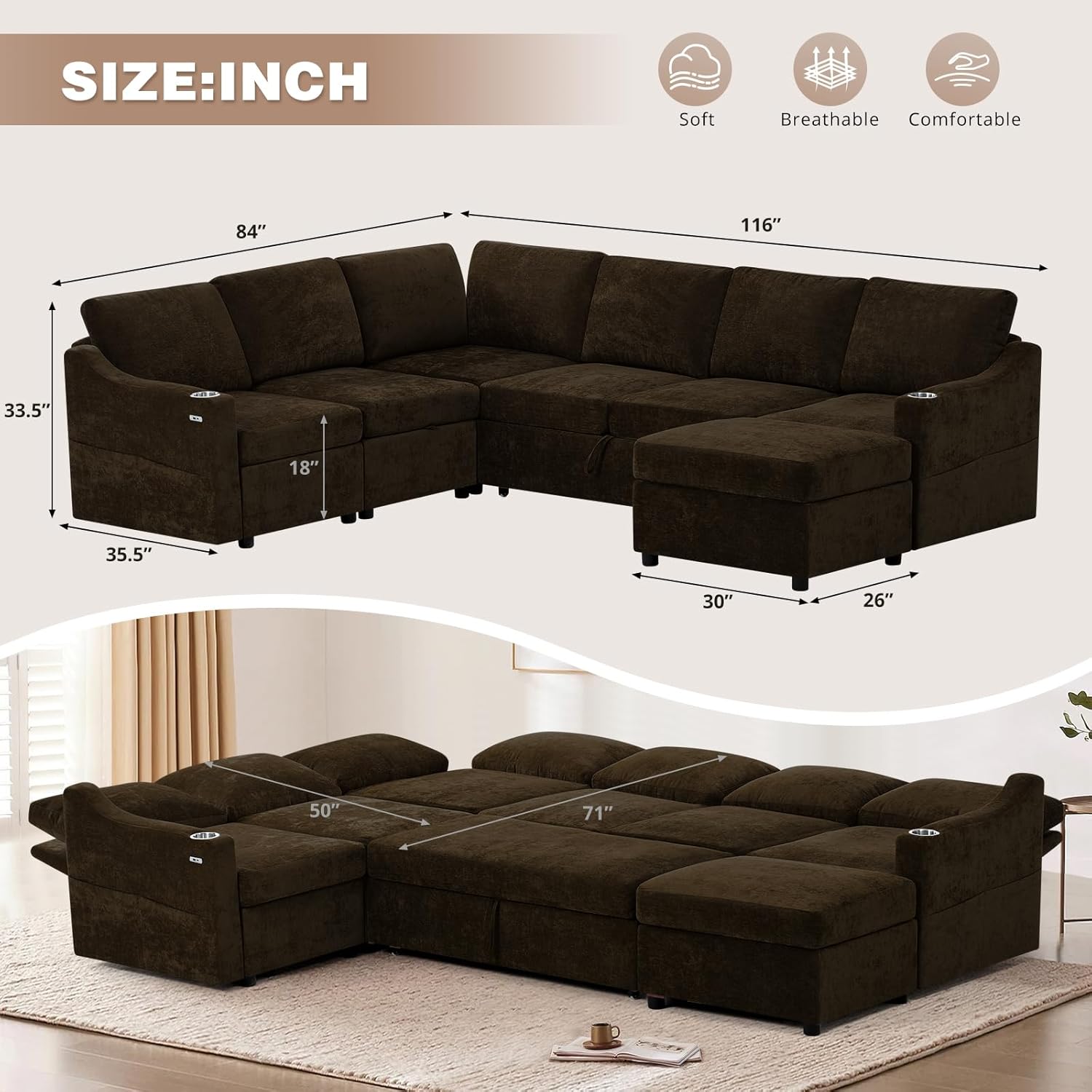 What sets this sectional apart is its thoughtful integration of everyday essentials: adjustable backrests, built-in USB charging ports, cup holders, and generous under-seat storage. Every detail supports a clutter-free, functional environment that still feels inviting and luxurious. From the soft chenille fabric to the resilient cushioning, every element is crafted to provide lasting comfort and durability—even with daily use.