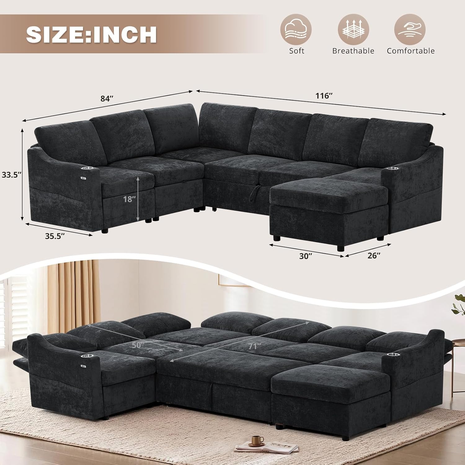 This 116-inch chenille modular sofa bed offers a perfect blend of style, comfort, and practicality for modern living spaces. Designed with versatility in mind, it transforms seamlessly from a spacious seating area into a full-sized sleeper, making it ideal for apartments, small homes, or multi-functional family rooms. The U-shaped sectional layout provides generous seating for up to six people, while its modular construction allows you to arrange the pieces according to your room layout and personal preference. Whether used daily as a lounge or reserved for guests, this sofa adapts effortlessly to your lifestyle needs without compromising on elegance or functionality.