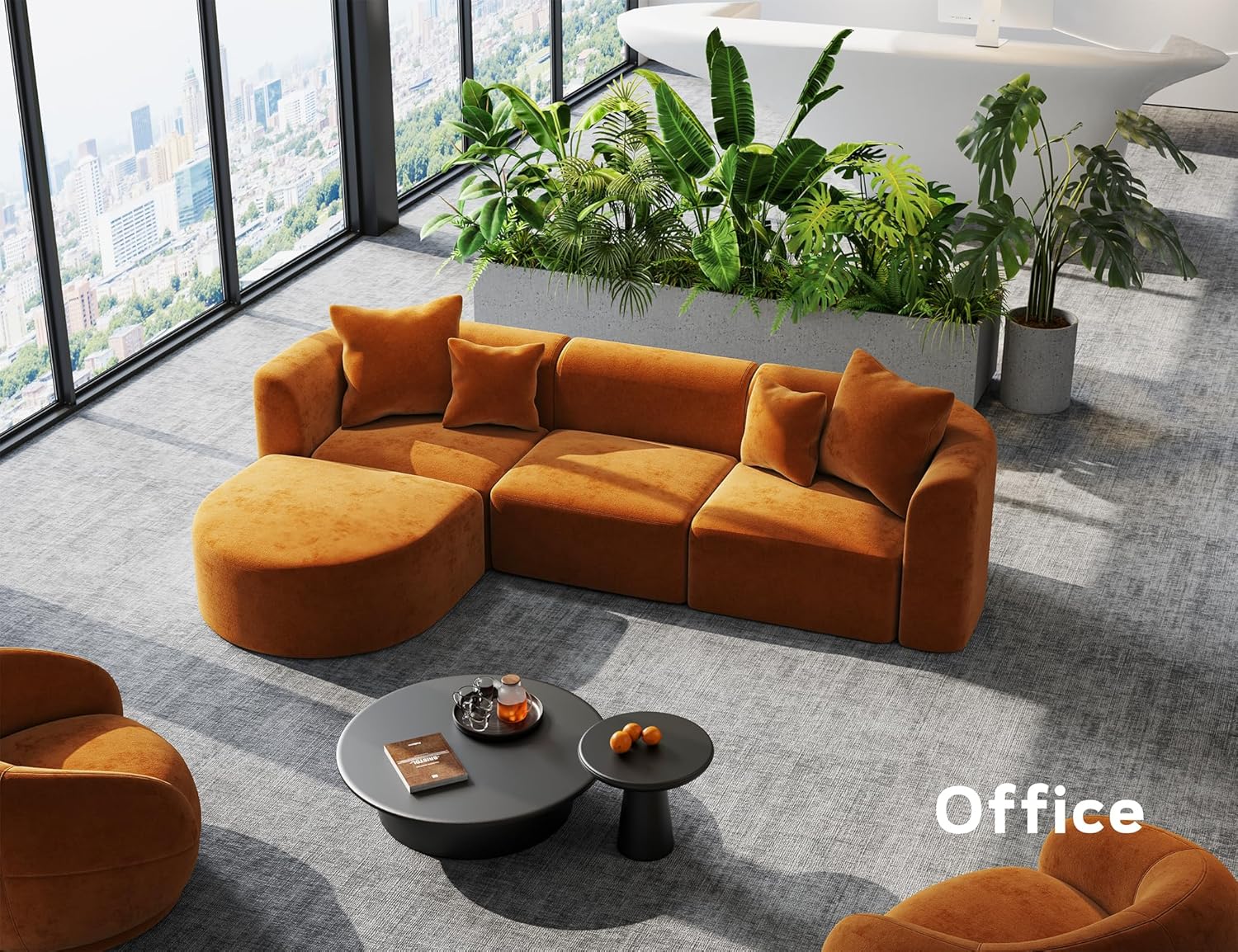 Transform your living space with this luxurious 116″ modular sectional couch, thoughtfully designed for modern homes that value both comfort and style. Featuring premium fuzzy upholstery and a sleek minimalist aesthetic, this oversized four-seat sofa combines plush texture with clean, flowing lines to create an inviting centerpiece for any room. The vibrant tangerine hue adds a bold, contemporary touch while maintaining sophisticated elegance. Ideal for studio apartments, open-concept living areas, or small entertainment spaces, this boneless L-shaped couch delivers immediate comfort without the hassle of assembly—simply unpack and enjoy.