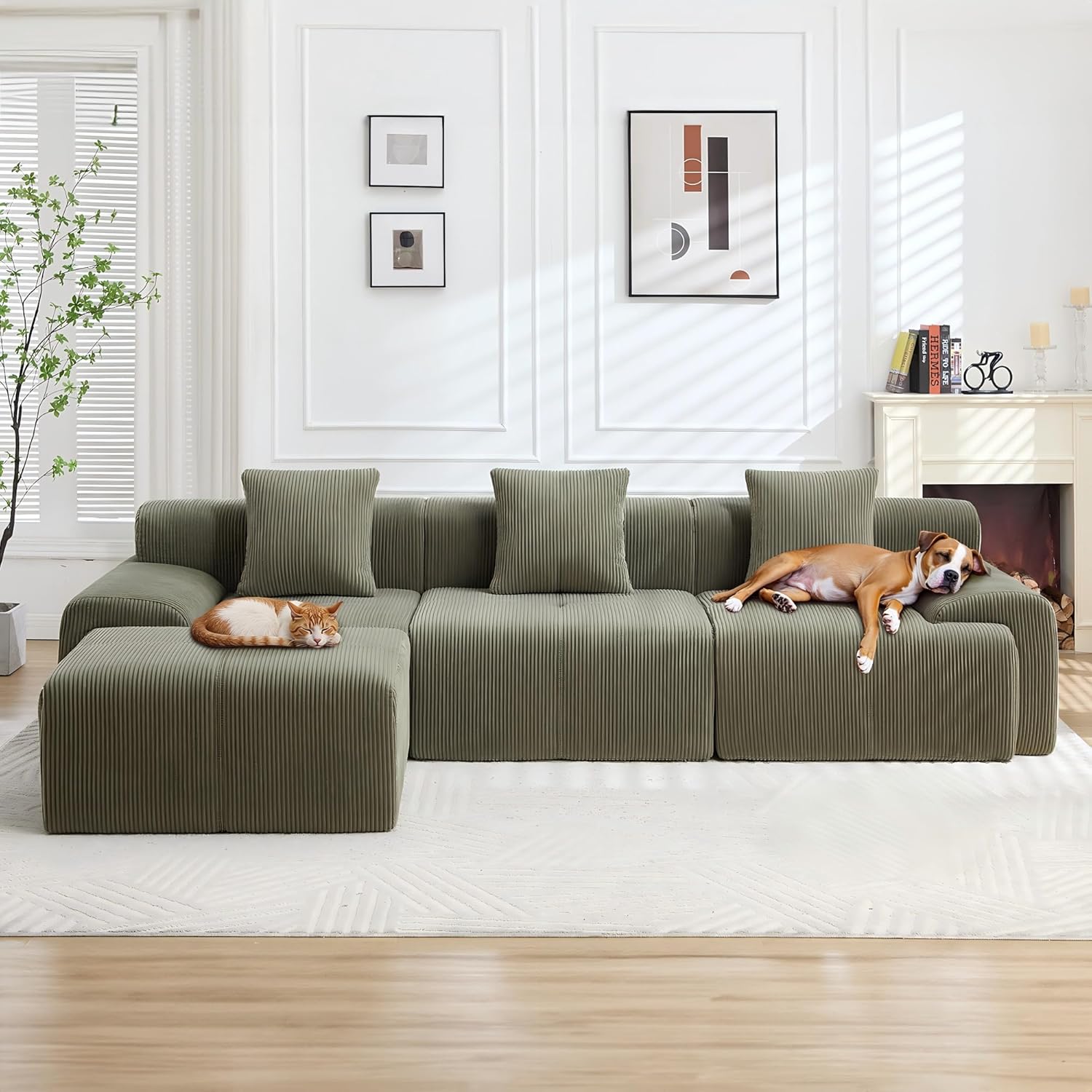 This 118″ modern L-shaped modular sectional sofa redefines flexible living with its innovative boneless construction and plush corduroy upholstery. Designed for today’s dynamic homes, it combines deep-seated comfort with effortless reconfiguration—perfect for transforming your space from a cozy family lounge to an entertaining hub at the flip of a few modules. The oversized 3-seater layout offers generous seating for up to six people, making it ideal for hosting movie nights, game evenings, or casual gatherings without compromising on style or support.