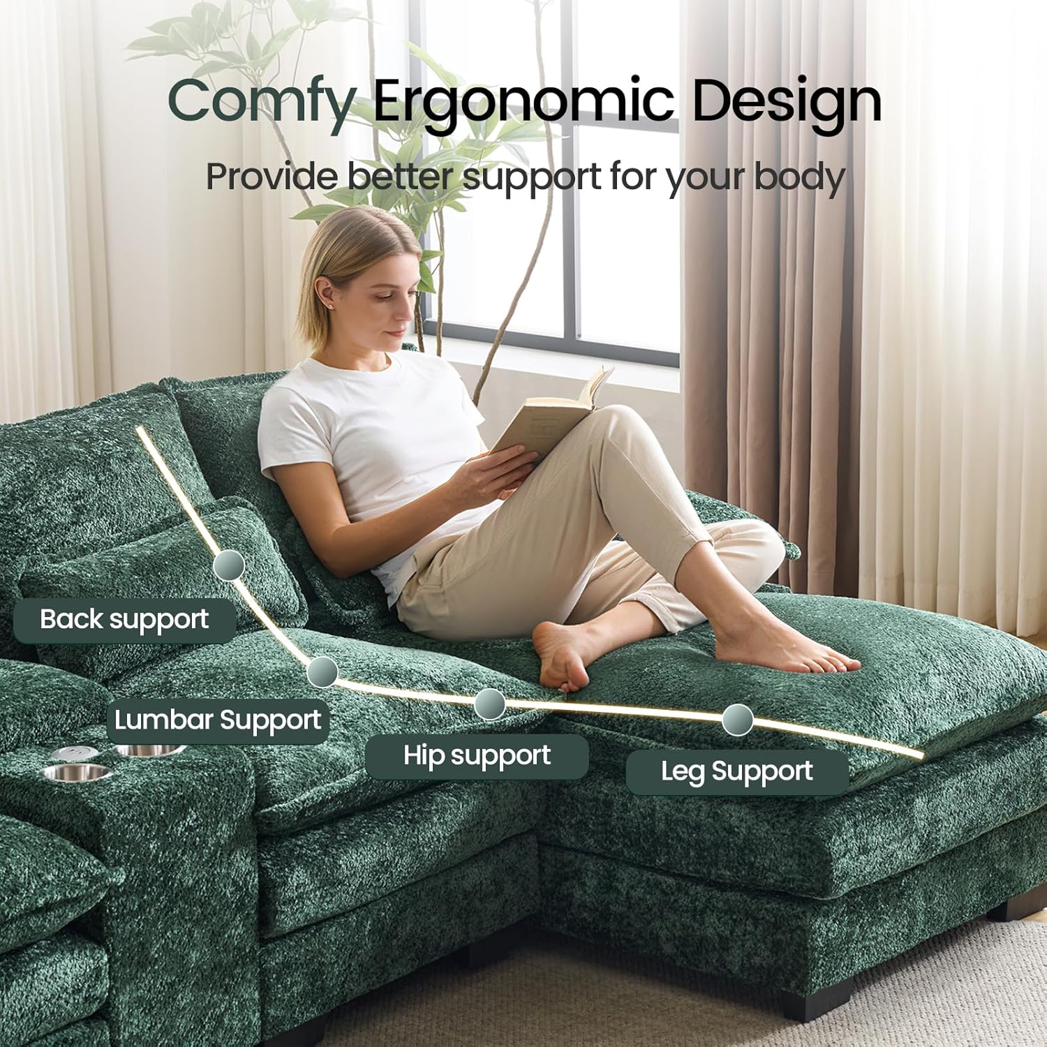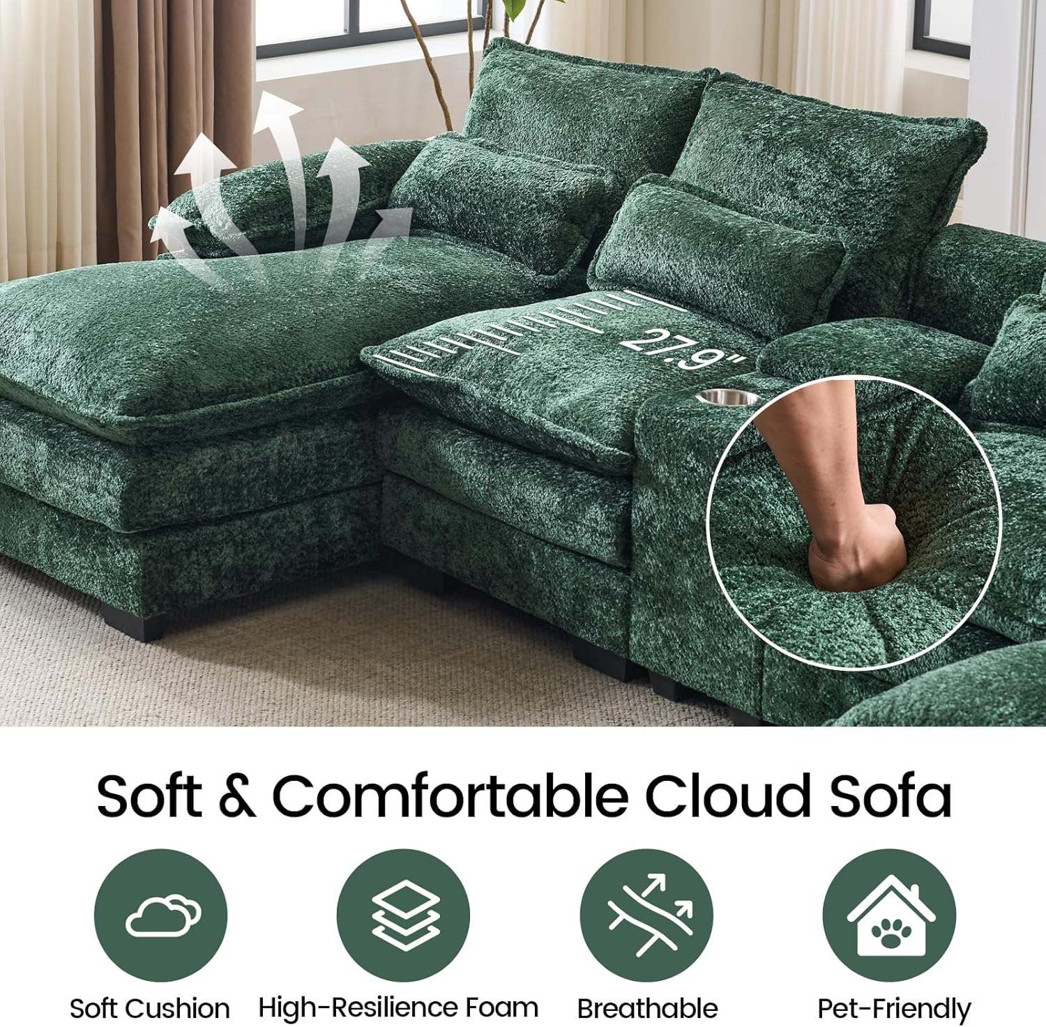 This U-shaped cloud modular sofa is designed to elevate your living space with a perfect blend of comfort, functionality, and modern aesthetics. Ideal for living rooms, offices, studies, or home theaters, it features a spacious U-shape layout with integrated chaise lounges that offer generous seating for multiple people. The deep seat design and plush cushions provide a cloud-like experience, making it ideal for extended relaxation, casual conversations, or unwinding after a long day. Crafted from premium chenille fabric in a rich green tone, the sofa adds warmth and texture to any room while maintaining durability against daily use.