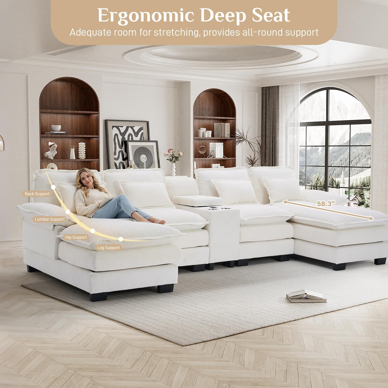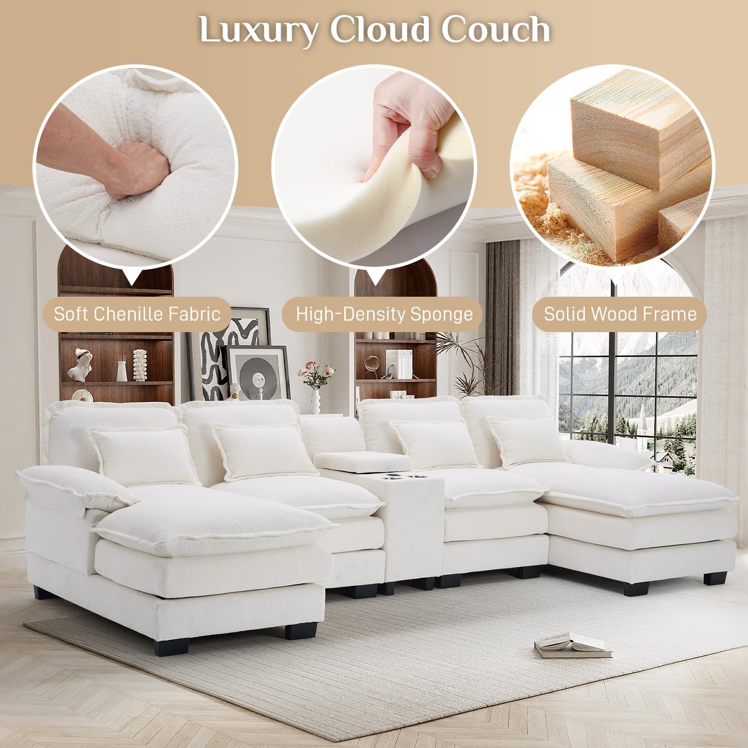 This U-shaped modular sectional sofa offers a spacious, cloud-like seating experience designed for maximum comfort and modern living. Ideal for families or social gatherings, it combines deep seating with a double chaise lounge to accommodate multiple people comfortably. Crafted from premium chenille fabric and filled with high-density memory foam, the sofa provides durable, scratch-resistant support that maintains its shape over time. With added features like a built-in console with USB ports, cup holders, and hidden storage, this oversized couch blends luxury and practicality for any home environment.