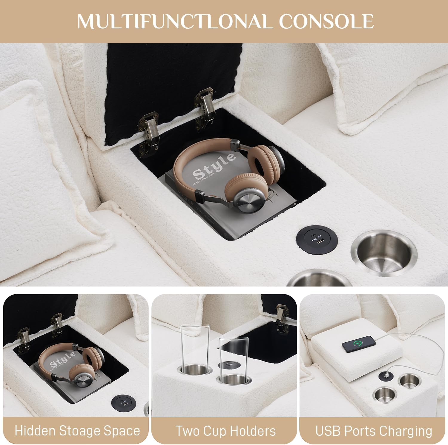 • Multi-Function Central Console: Features dual USB charging ports for convenient device power-up, an anti-spill cup holder for drinks, and a hidden storage compartment for organizing remotes, snacks, magazines, and other essentials.
