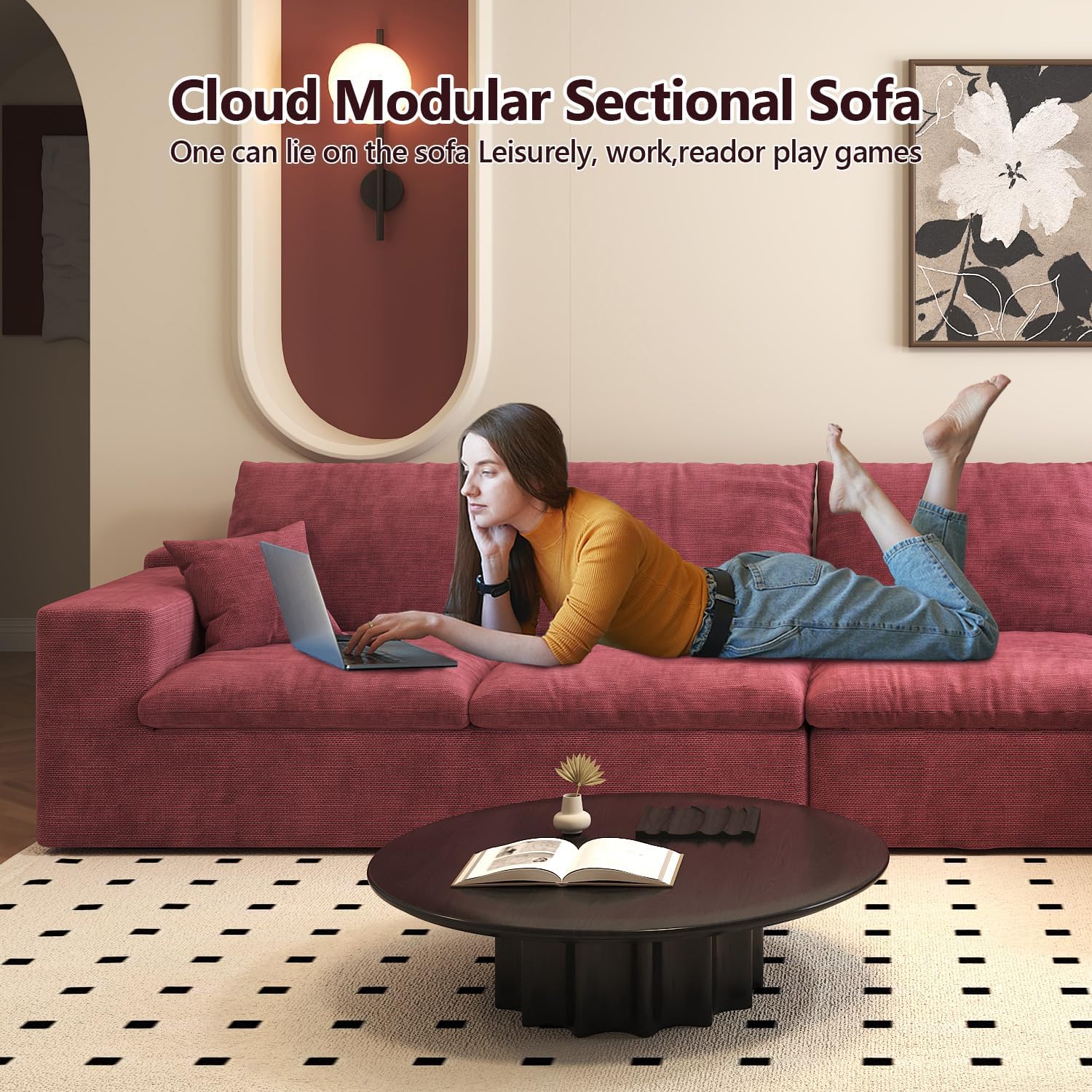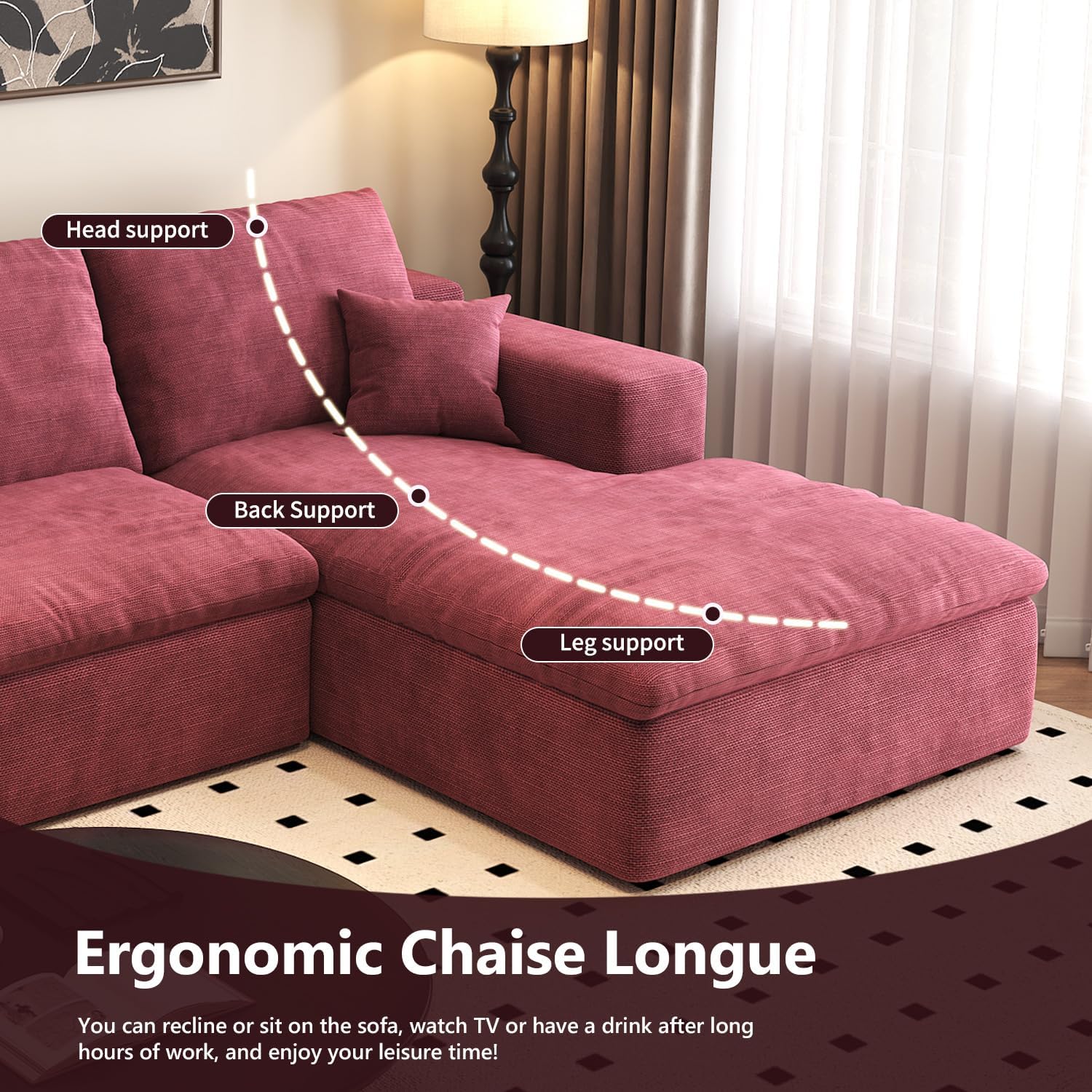 This modern L-shaped sectional sofa offers a luxurious cloud-like seating experience, combining deep-seat comfort with modular flexibility. Designed for living rooms, bedrooms, or apartments, it features high-resilience foam and memory foam filling that provides lasting support and softness. The wine red chenille fabric adds warmth and sophistication to any space, while the frameless design enhances its contemporary look. Ideal for small to medium-sized spaces, this 4-seat couch delivers both style and functionality with its plush cushions, thick armrests, and deep seating depth.