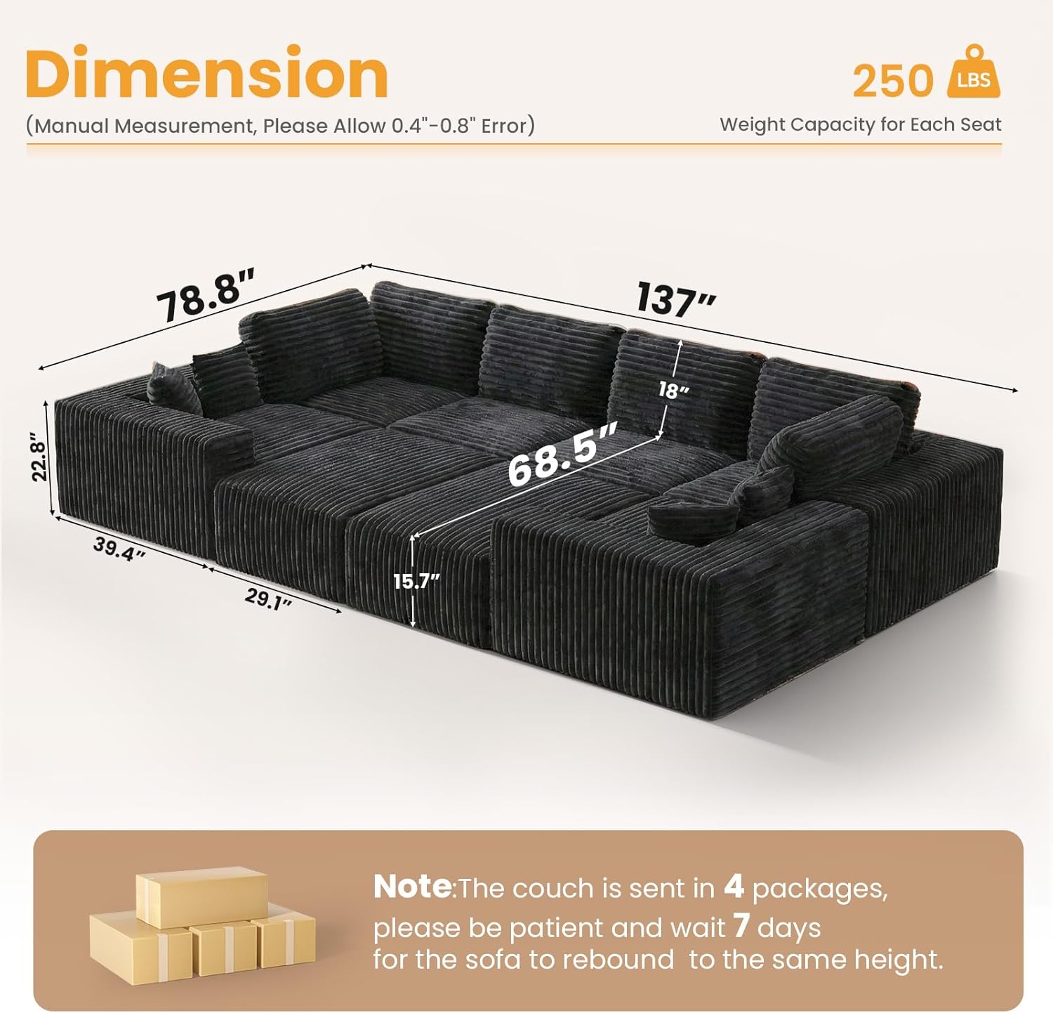 This 137″ modular sectional sofa redefines comfort and adaptability in modern home furniture. Designed as a versatile U-shaped cloud couch, it transforms effortlessly into L-shape or sleeper configurations using its eight movable pieces—perfect for large living rooms, apartments, or multi-purpose bedrooms. Engineered with deep seats and a boneless construction, this sectional offers a luxurious lounging experience without the hassle of assembly. The inclusion of two removable ottomans adds functional flexibility, serving as footrests, additional seating, or even a temporary coffee table during gatherings. With its soft corduroy upholstery and high-resiliency foam filling, this sofa delivers lasting comfort and easy reconfiguration to suit any space or occasion.