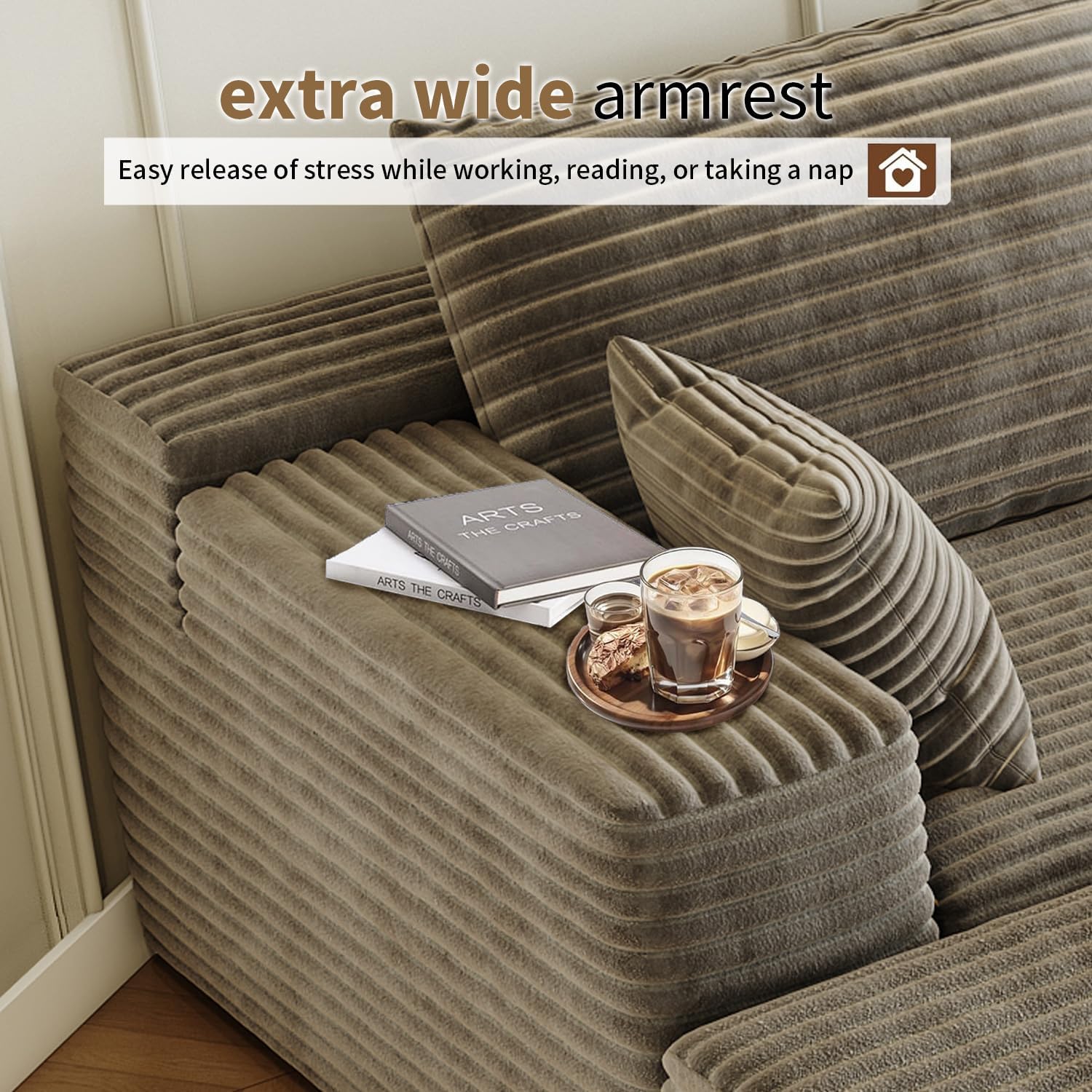 While the sofa arrives pre-assembled, users should ensure adequate space for delivery and placement due to its substantial size (over 11 feet long). Corduroy fabric may require regular vacuuming and occasional spot cleaning to maintain appearance; consult care instructions upon delivery for best maintenance practices. Because modular components connect via built-in connectors, rearrangement should be done carefully to avoid misalignment. This product does not include cushions or throw pillows unless explicitly mentioned in packaging—verify included items before use.