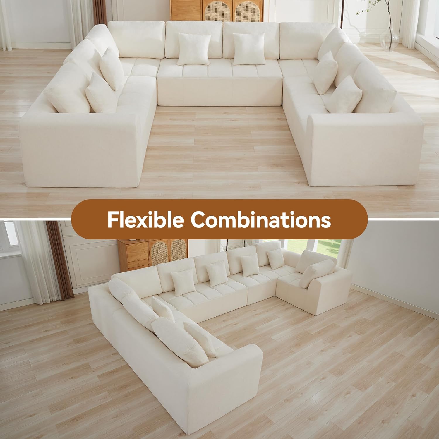 This oversized U-shaped modular sectional sofa redefines comfort and adaptability in modern living spaces. Designed to comfortably seat up to nine people, it transforms any room into a welcoming lounge or entertaining hub without the hassle of assembly. With its deep 20.5-inch seat depth and cloud-like cushioning, every sitting experience feels indulgent and restorative. The sofa arrives fully compressed in multiple boxes—typically two or more—and naturally expands to full size within 48 to 72 hours after unpacking. Whether your space calls for an open L-shape, a compact linear layout, or a spacious U-configuration, this sectional adapts effortlessly to suit your needs. Its thoughtful design includes memory foam pillows, elegant tufted detailing, and premium chenille fabric, combining luxury with everyday practicality.