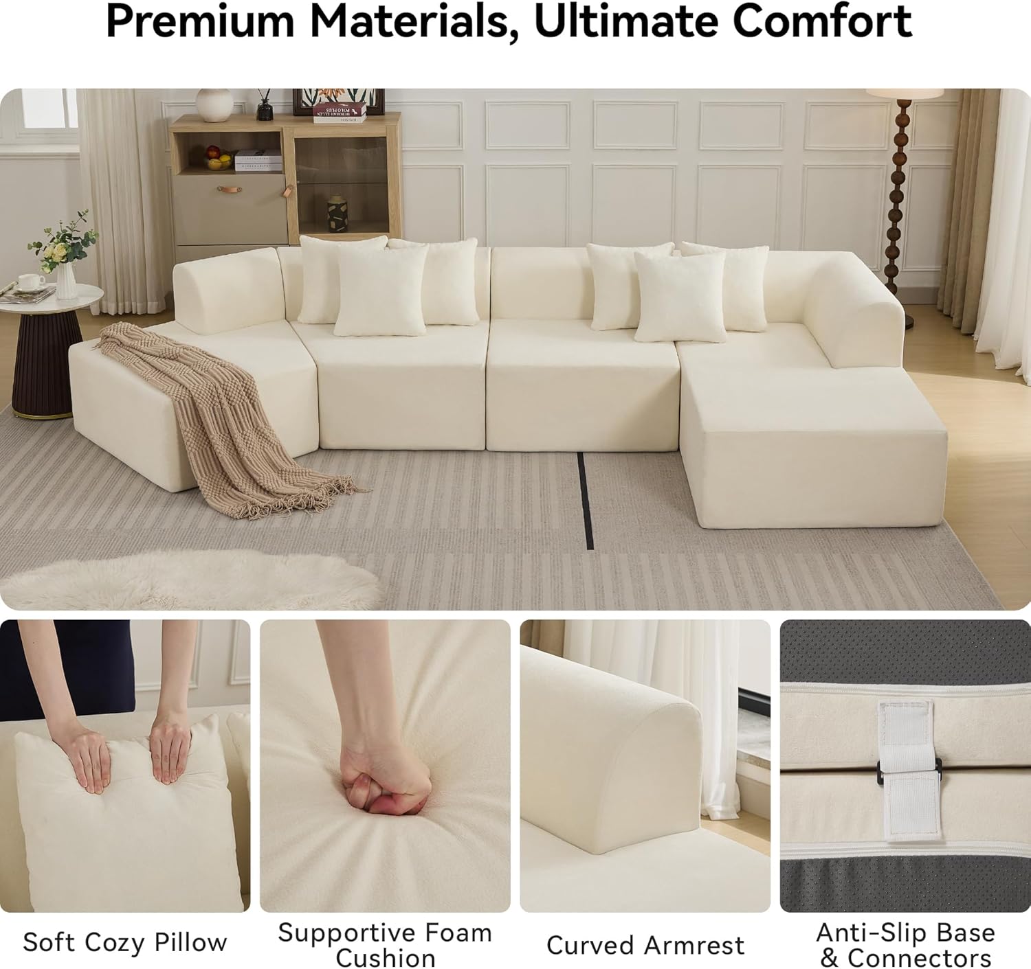 This oversized cloud velvet curved sectional couch redefines modern living room comfort with its luxurious design and unmatched relaxation experience. Spanning an impressive 140 inches in length, this boneless L-shaped modular sofa is crafted for spacious lounging, making it ideal for families, entertaining guests, or simply unwinding after a long day. The built-in chaise adds both visual interest and practical functionality, while the ultra-soft “cloud fleece” upholstery and high-resilience memory foam ensure lasting support and breathable comfort. Designed for effortless enjoyment, this sectional requires no assembly—just unpack, pat gently, and let your new centerpiece return to its full form within 72 hours.