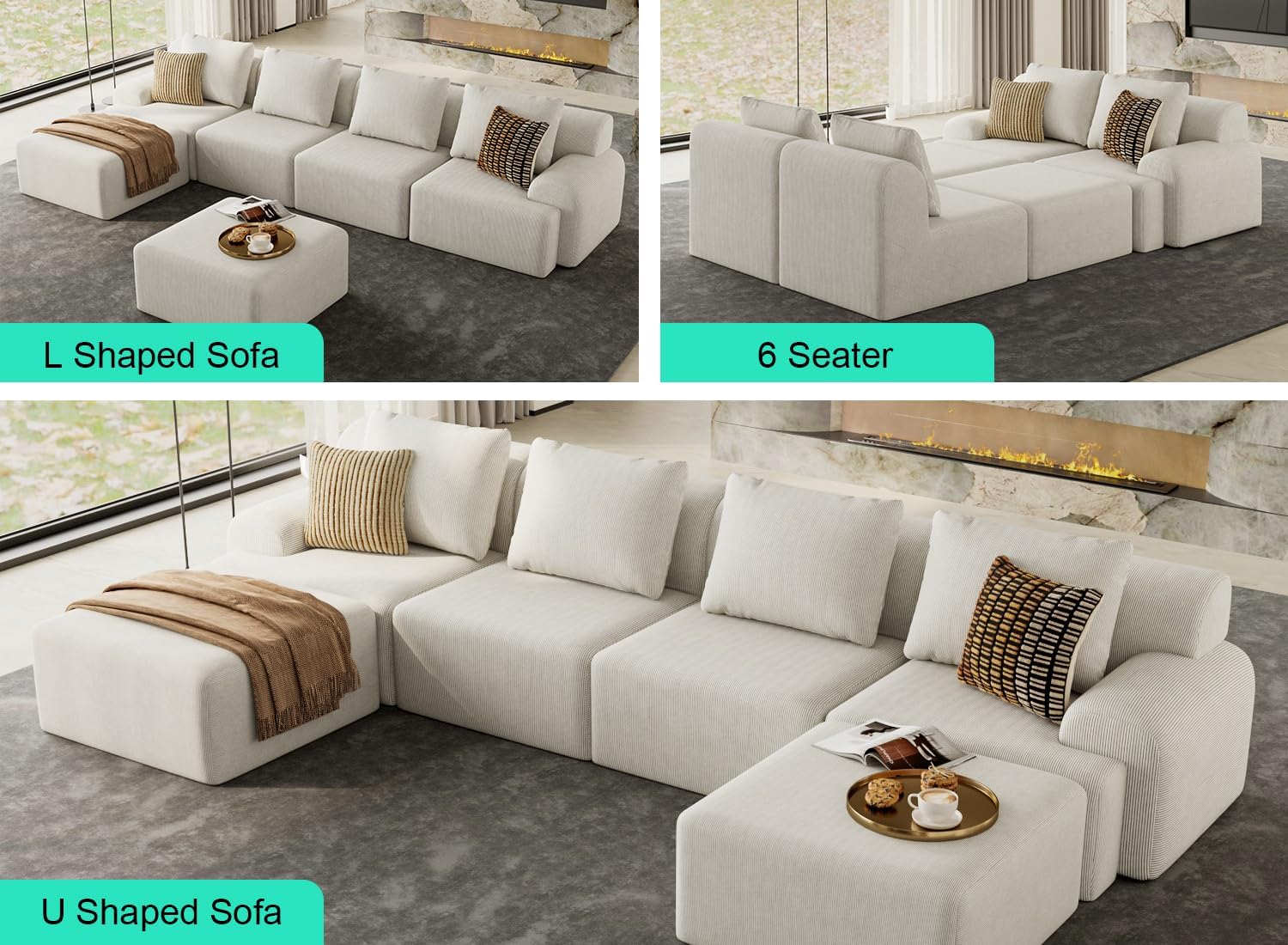This oversized couch is specifically engineered for larger living spaces where comfort and social seating are priorities. The U-shape efficiently utilizes corners, making it a smart choice for open-plan homes, family rooms, or entertainment areas with large windows. Its deep cushions invite extended lounging—whether you’re hosting movie nights, reading a book, or enjoying quiet moments with coffee and conversation. The neutral beige corduroy fabric complements a wide range of interior styles, from contemporary minimalist to rustic farmhouse, without overwhelming the space.
