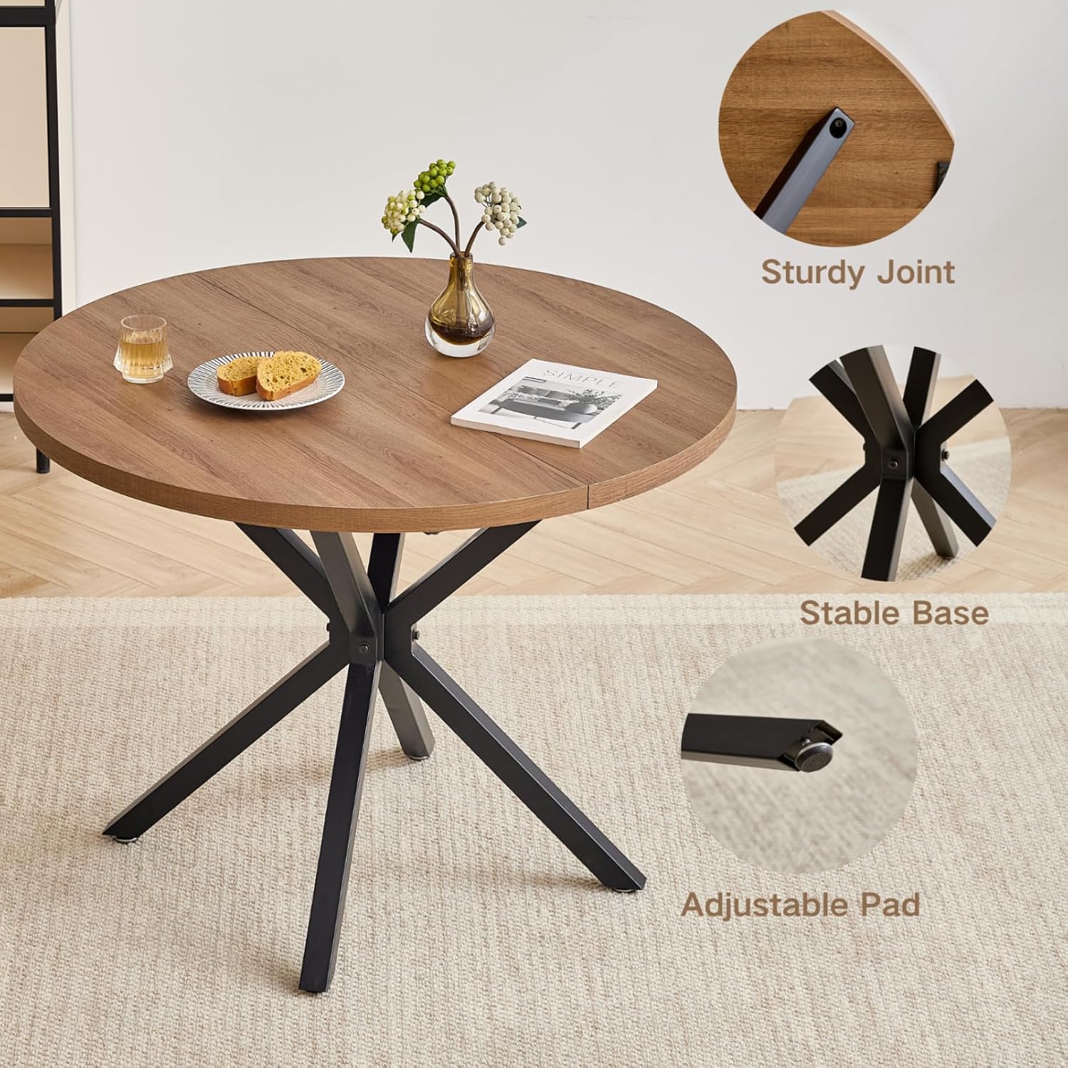 - The round table measures 39 inches in diameter, providing generous surface area for meals, projects, or socializing while maintaining a low visual footprint ideal for smaller rooms.