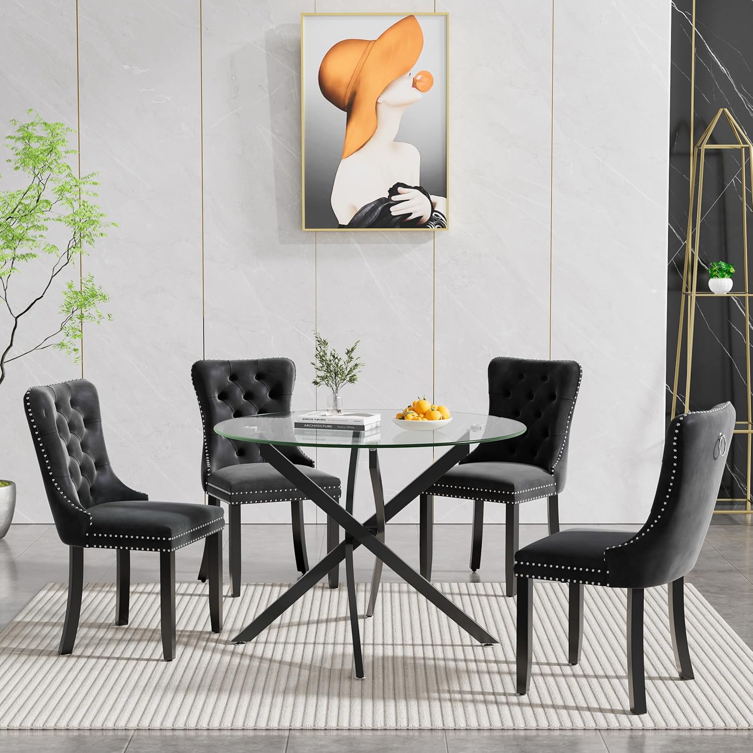 This 5-piece dining table set combines modern elegance with everyday practicality, designed to elevate both kitchen and dining room spaces. Featuring a sleek 36-inch round glass top supported by sturdy cross-shaped metal legs, the table offers a luxurious yet functional centerpiece for meals and gatherings. The set includes four matching black velvet upholstered chairs that complement the table’s refined aesthetic while providing comfortable seating for up to four people. Crafted from high-quality materials, this dining set is built to withstand daily use while maintaining its sophisticated appearance. Whether used in a compact apartment or a spacious home, it delivers a harmonious balance of style, durability, and space efficiency.