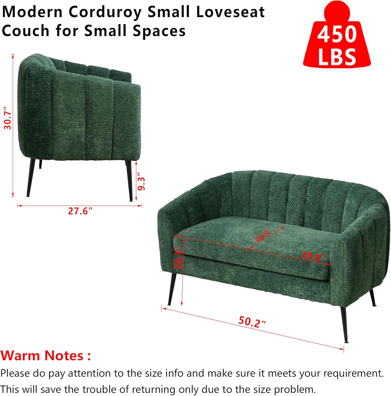 - Compact Yet Spacious Design: At just 50.2 inches in length, this two-seater couch fits comfortably in tight quarters—perfect for apartments, bedrooms, RVs, or small offices. Despite its modest size, the internal construction supports up to two adults comfortably, making it a practical choice for individuals or couples.