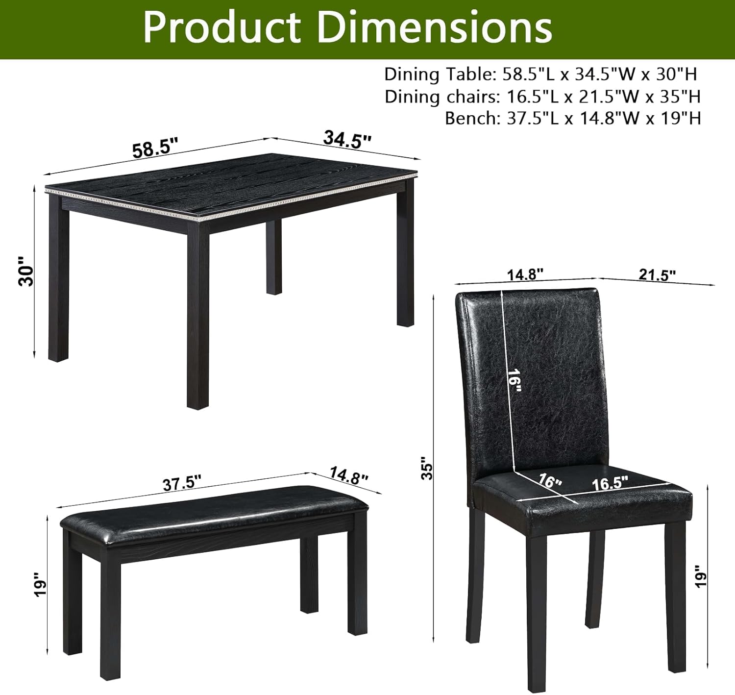 When selecting furniture for your dining space, it’s important to find a balance between durability, comfort, and aesthetic appeal. This 6-piece set excels in all three areas. The mix of engineered and natural woods ensures strength and longevity, while the upholstered seats add a layer of comfort often missing in similarly priced sets. The inclusion of a bench maximizes seating capacity without requiring additional chairs, making it especially valuable in homes where space is limited. The black finish is both timeless and versatile, allowing it to adapt to evolving décor trends without needing replacement. Whether you’re furnishing a new apartment, updating an existing dining room, or looking for a reliable guest-ready solution, this set meets those needs with minimal fuss and maximum value.