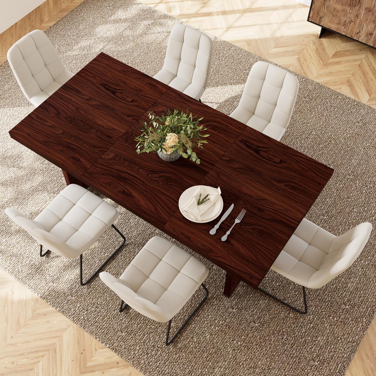 This 7-piece dining table set is thoughtfully designed to bring comfort, style, and functionality to your home. Perfectly sized for six people, the 70.8-inch MDF tabletop in a rich walnut finish offers ample space for family meals, casual dinners, or even remote work sessions. Paired with six generously upholstered white chairs, this set blends timeless farmhouse charm with modern practicality. Whether you’re hosting guests, enjoying breakfast at home, or creating a cozy nook in a smaller living space, this dining set delivers both aesthetic appeal and reliable performance. The neutral color palette ensures seamless integration into a variety of interior styles, from rustic to contemporary.