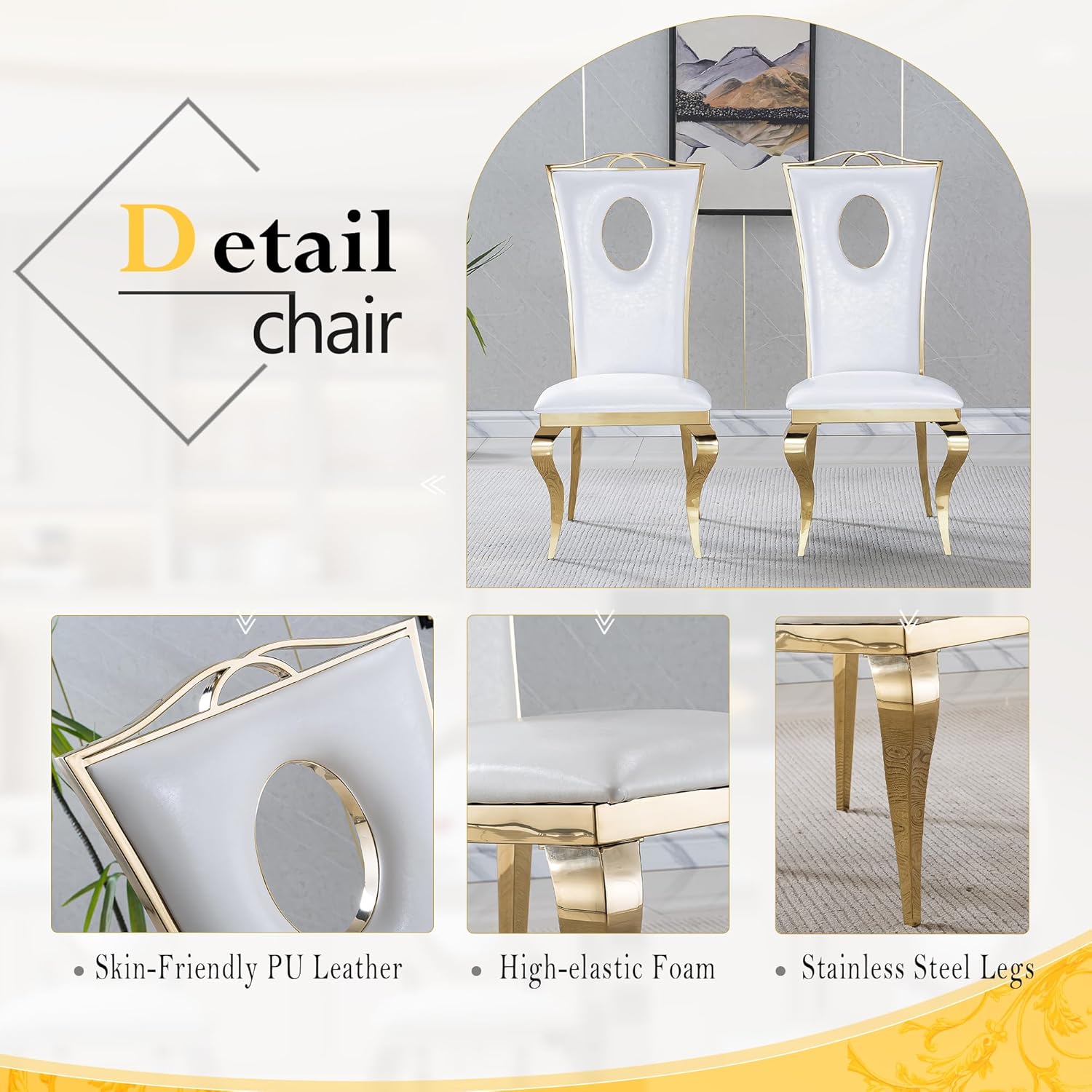 - Color Scheme: Primary white tone for table and upholstery; secondary gold accent on metal components