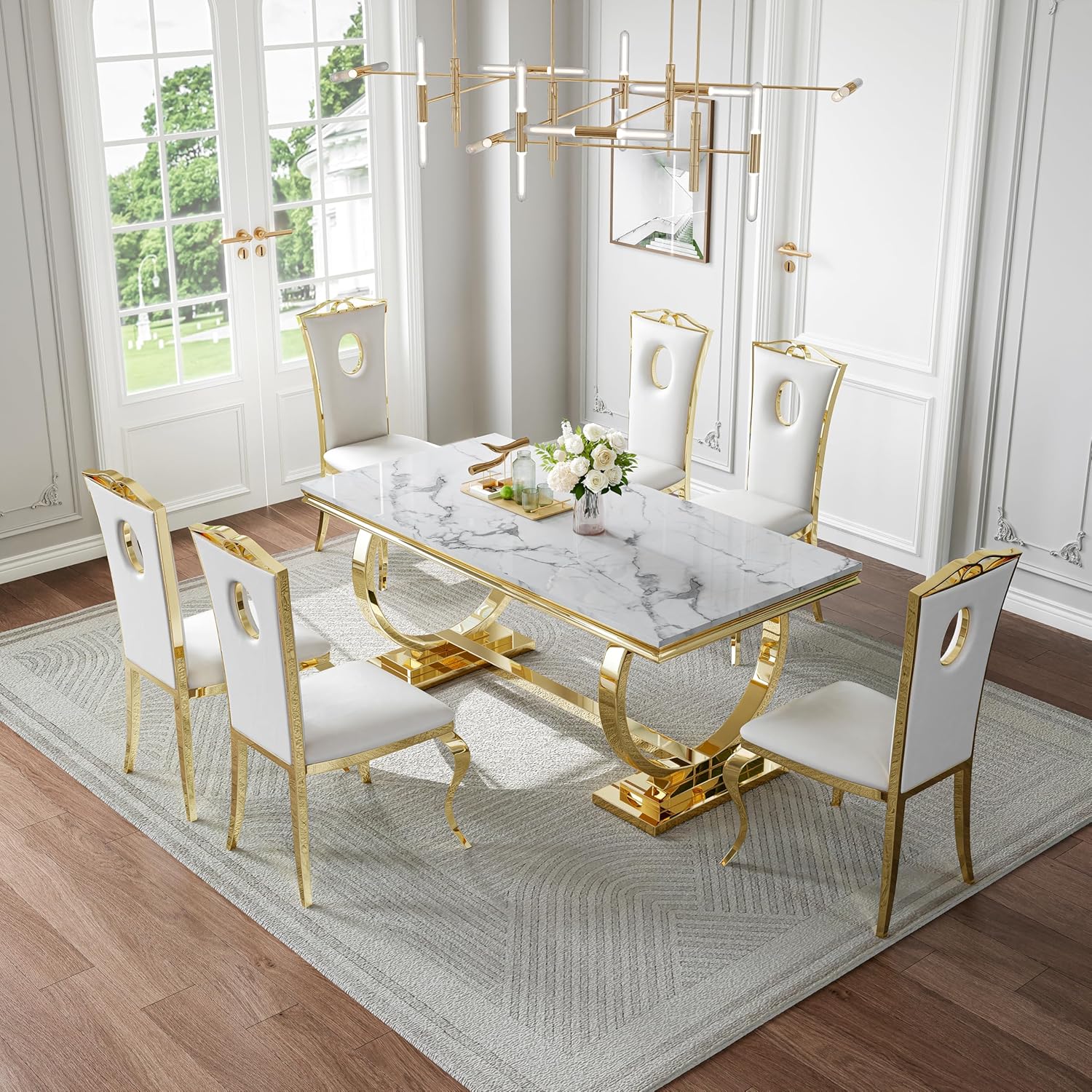 Designed with both form and function in mind, this dining set offers homeowners and renters alike a way to instantly elevate their living spaces. The large 70-inch table provides plenty of room for shared meals, board games, or serving platters, while the white marble top resists staining when properly maintained—making it suitable for daily family life as well as special occasions. The mirrored stainless steel base adds a modern edge, helping to reflect light and make smaller rooms appear more open, which is especially beneficial in compact urban apartments or studio layouts.