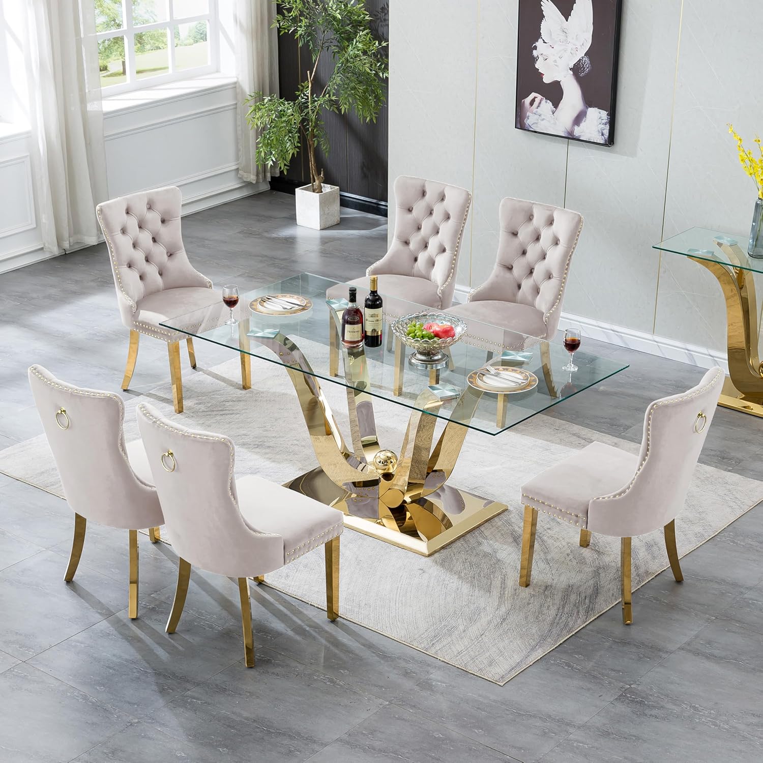 Transform your dining experience with this stunning 70″ Modern Gold Glass Dining Table Set, expertly designed to serve six guests in style and comfort. This sophisticated set features a spacious rectangular table crafted from durable tempered glass, supported by a gleaming mirrored stainless steel base finished in luxurious gold. Paired with six matching beige velvet upholstered chairs featuring tufted backs and elegant nailhead trim, this collection blends contemporary elegance with everyday practicality. Whether you’re hosting intimate family dinners or entertaining friends, this dining set creates a refined focal point in any modern kitchen or dining room.
