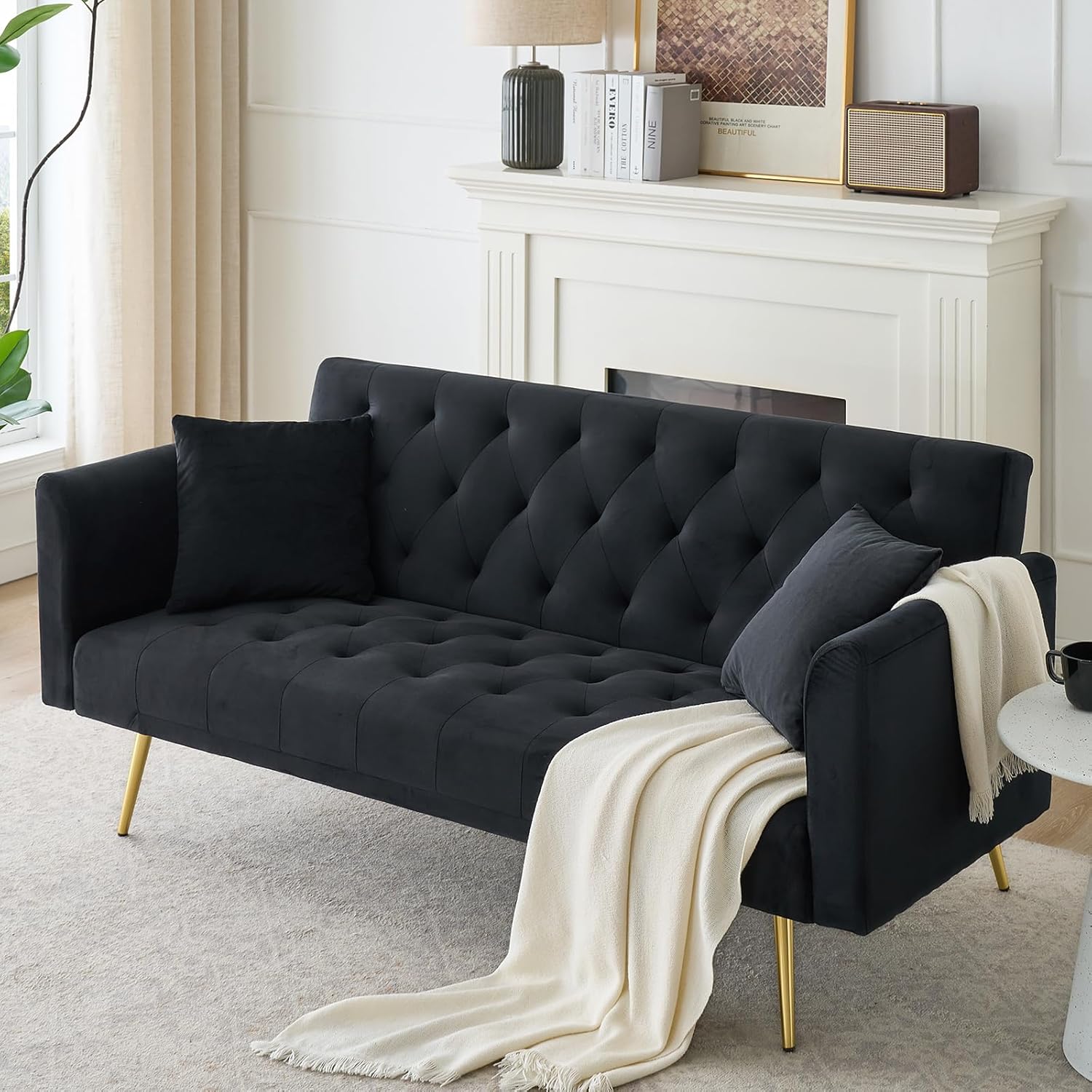 The 71″ Modern Velvet Sofa Bed Futon is a thoughtfully designed, multi-functional furniture piece crafted for modern living in compact spaces. Whether you’re furnishing a studio apartment, updating a guest room, or seeking a stylish solution for a small living area, this convertible sleeper couch delivers both form and function with effortless elegance. Its sleek black velvet upholstery and refined tufted design create a luxurious aesthetic, while the sturdy construction ensures durability for everyday use. From casual lounging to unexpected overnight guests, this sofa adapts seamlessly—offering comfort, style, and practicality in one elegant package.