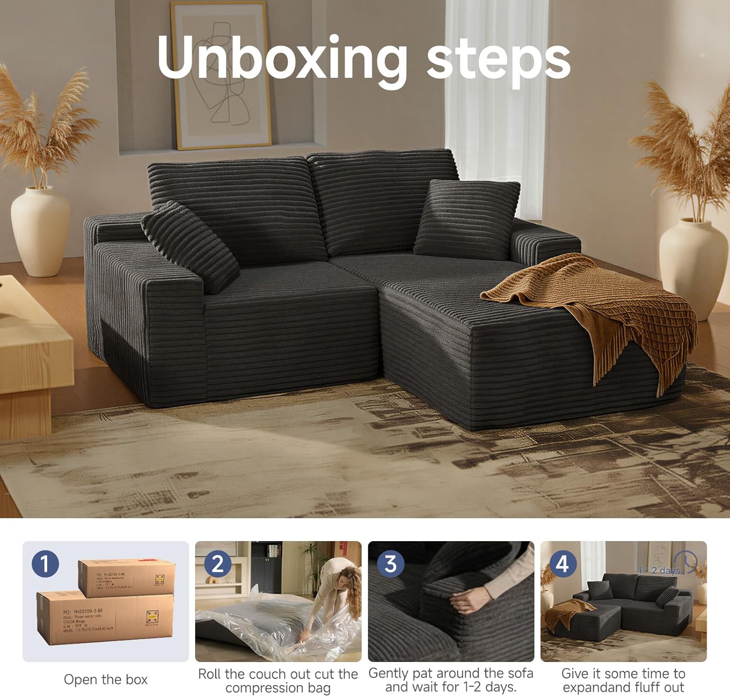 The 75″ Cloud Modular Boneless Couch redefines comfort with its L-shaped right-facing sectional design, crafted for modern living spaces where relaxation meets style. This deep-seat sofa combines plush corduroy upholstery with high-density memory foam cushioning to deliver a luxuriously soft, cloud-like experience. Engineered for effortless use, it arrives fully assembled—no tools, no hassle—and is perfect for both living rooms and bedrooms. Whether you’re curling up with a book, hosting friends, or simply unwinding after a long day, this modular sofa adapts seamlessly to your space without compromising on support or aesthetics.