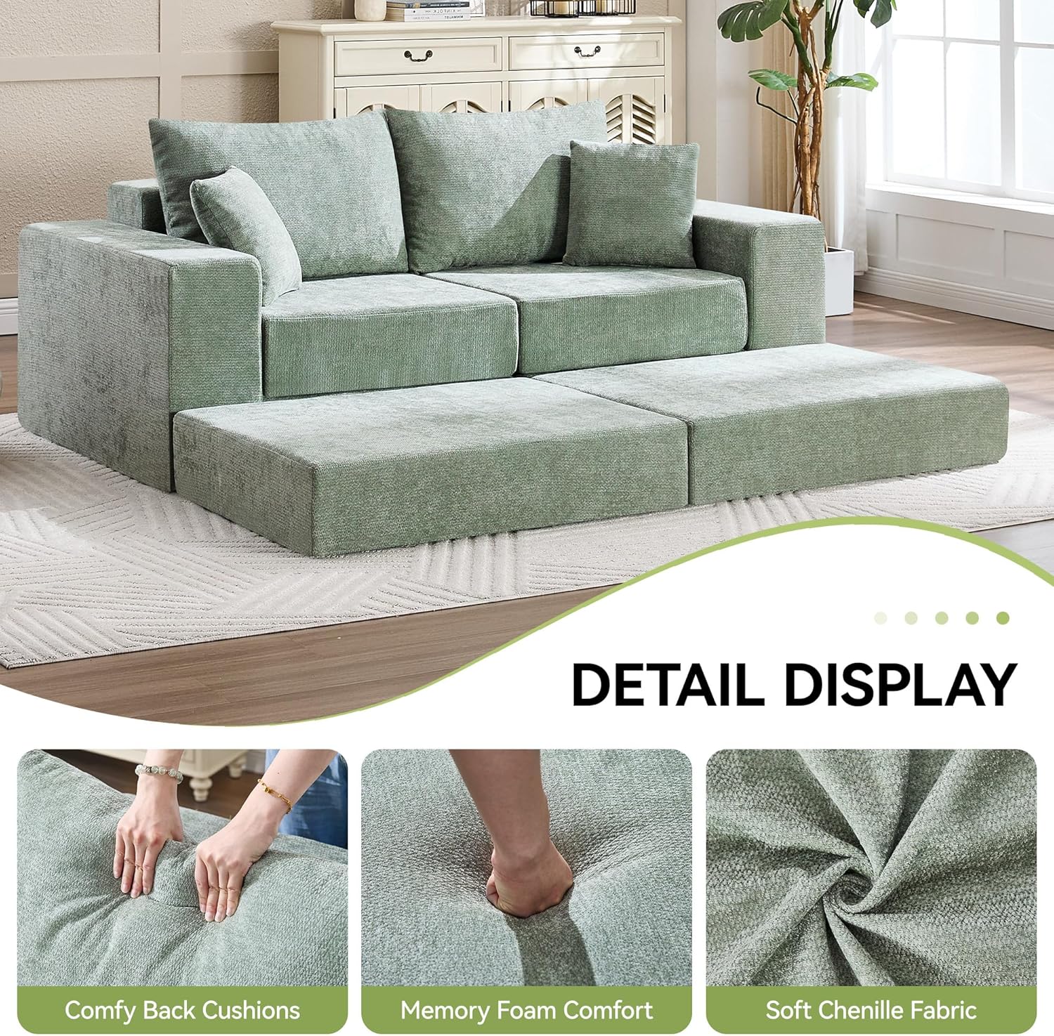- Customizable Modular Layouts: Includes 4 interchangeable seat units, 2 ottomans, and 4 soft pillows—allowing over 7 different configurations. Easily switch between a compact 2-seater love seat, L-shaped lounge, chaise setup, or full sofa bed to suit guests, mood, or room layout.