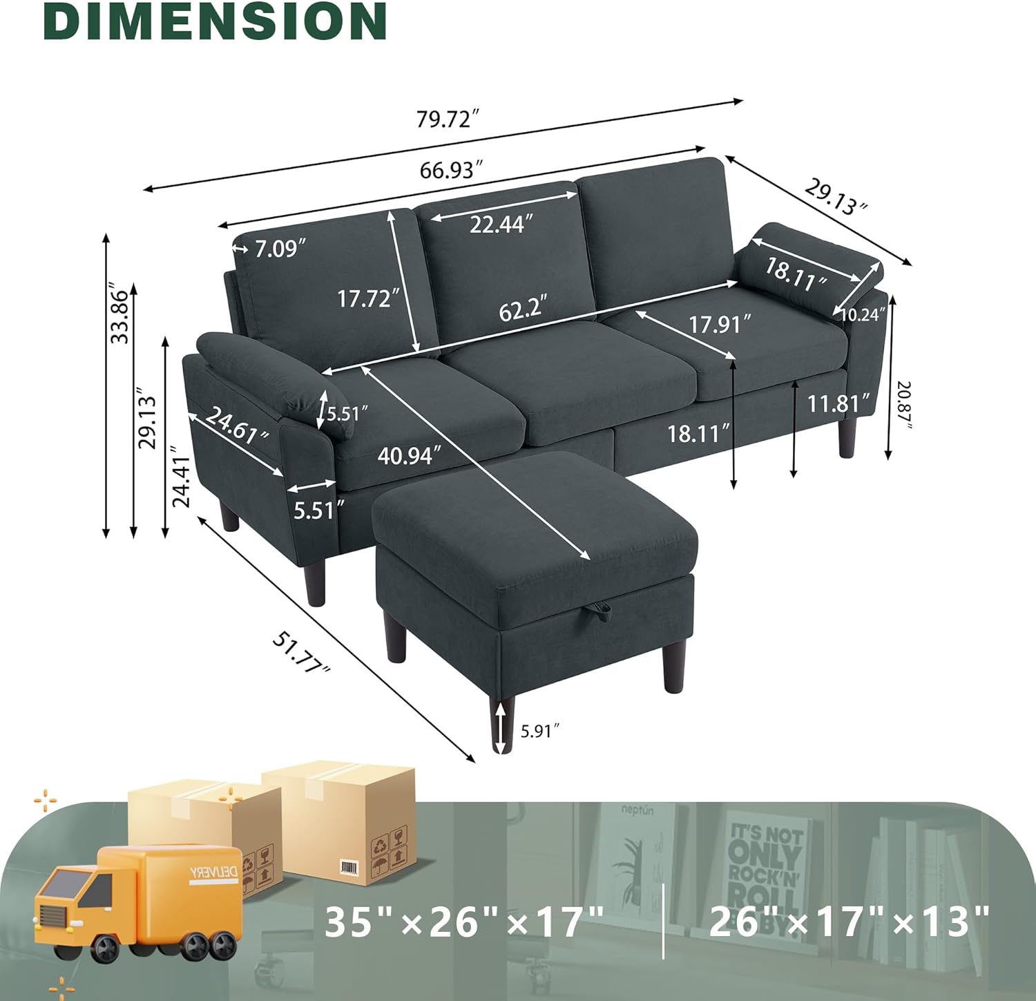 This couch is perfect size for apartments or smaller spaces. It was delivered quickly in 1 box. I put it together on my own and only took an hour and a half. The ottoman was honestly the longest part of the process. I saw reviews saying that the ottoman pieces dont line up with the provided screw placements. But they do, just make sure you’re staggering the side panels. The couch itself is just fastening hardware and then assembling. It feels sturdy and looks nice. It is a smaller sectional. Im 5′ and I find it very comfortable. Almost like it was made for me. However, I can see where a taller person wouldn’t find it as comfortable. It sits low, has a lower backrest. (Hits right at the base of my neck.) The arm rests have a cushion which was a huge plus for me because I love couch naps and yes, I have throw pillows but a cushioned armrest is more satisfying for me. The storage in the ottoman only fits a couple of fluffier blankets, rolled up which adds functionality. Overall, I’m more than satisfied with the value of this purchase.