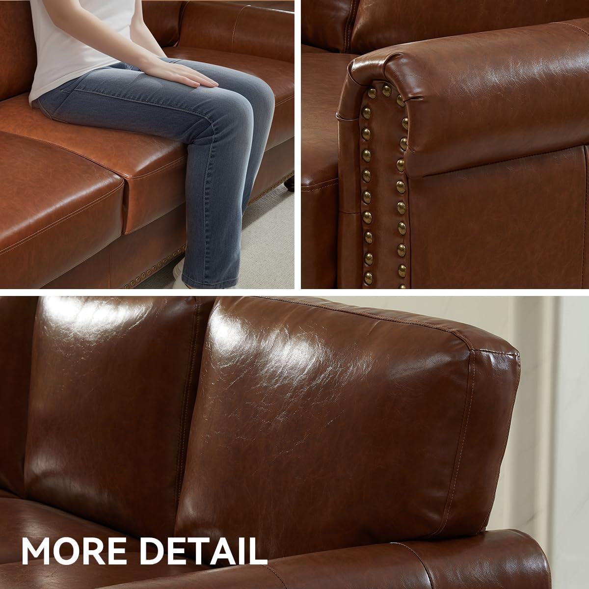 - Premium Faux Leather Upholstery: Crafted from high-quality faux leather, the sofa’s surface delivers a luxurious look and feel while being resistant to scratches, spills, and daily wear. It’s easy to wipe down with a damp cloth, ensuring your sofa stays looking fresh with minimal effort.