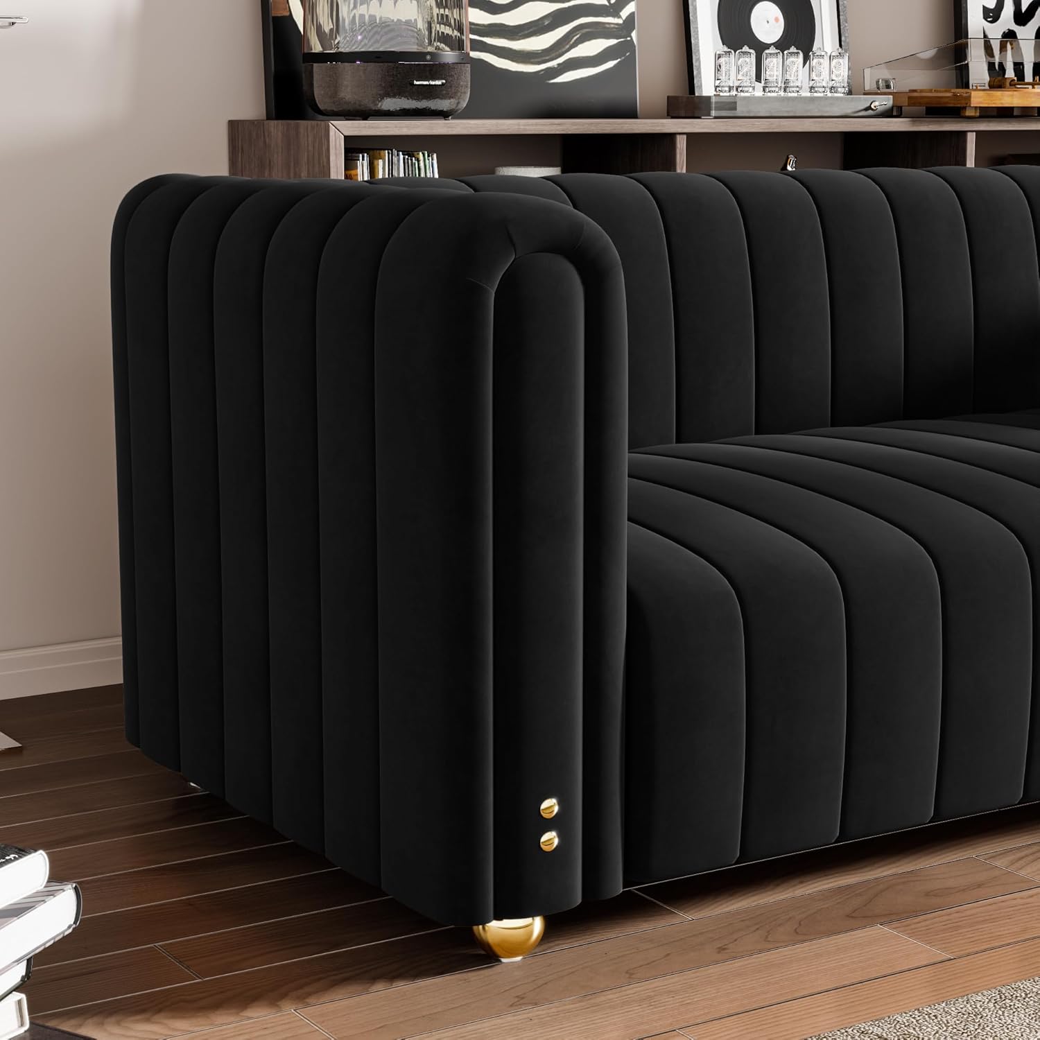 - Multi-Style Compatibility: Designed to harmonize with various decor schemes—from contemporary minimalism to vintage glamour—this sofa enhances your space without clashing with existing furniture. Its neutral black velvet upholstery complements both bold accents and subtle palettes.