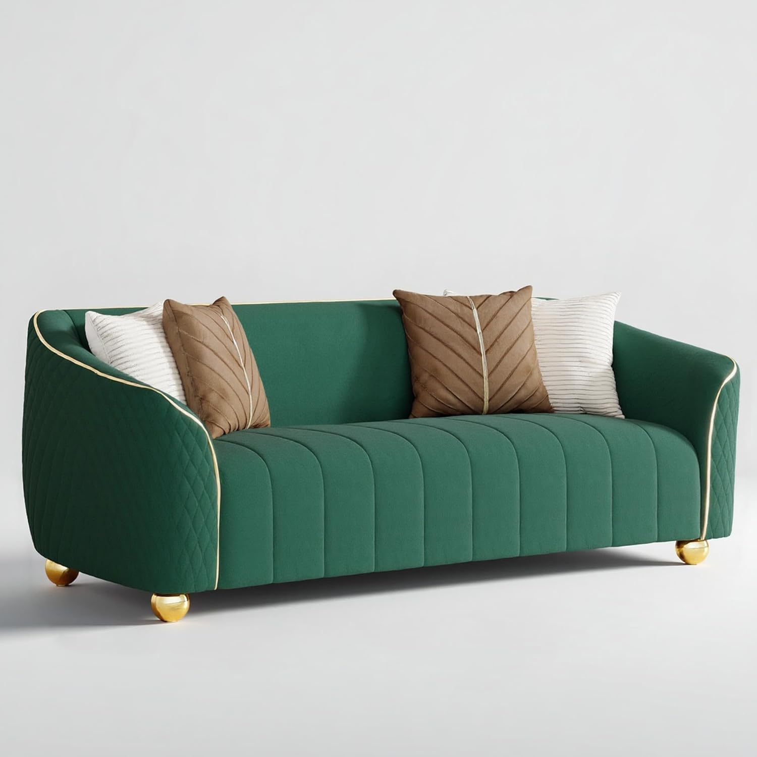 Elevate your living space with this luxurious 86-inch velvet sofa, a perfect fusion of modern design and timeless comfort. Tailored for compact environments such as small apartments, cozy bedrooms, or intimate living rooms, this 3-seater loveseat delivers both style and functionality without compromising on space. Featuring premium 100% polyester duvet velvet upholstery, the sofa offers a sumptuously soft texture that feels gentle against the skin while maintaining durability through daily use. Its retro-inspired silhouette is accented by elegant gold metal legs and comes complete with coordinating throw pillows, making it an ideal centerpiece for contemporary or vintage-modern interiors.