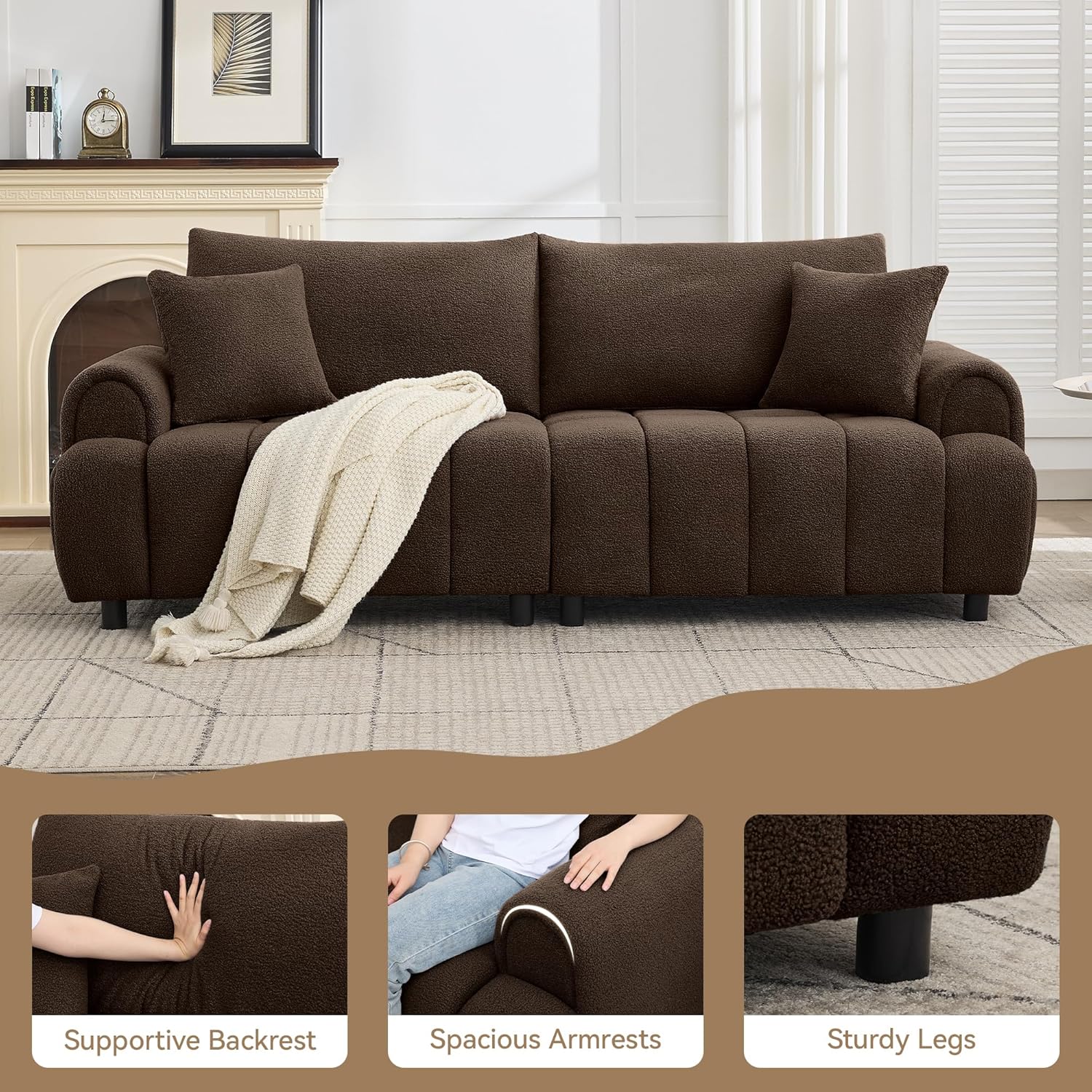 This modern boucle sofa couch is a thoughtfully designed 3-seater loveseat that combines contemporary aesthetics with everyday comfort. Crafted with a deep seat and oversized frame, it offers generous space for lounging, entertaining, or simply unwinding at home. The soft, sculptural silhouette—defined by rounded arms and elegant channel tufting—creates a welcoming focal point in any room. Wrapped in textured boucle sherpa upholstery, the sofa delivers both visual depth and tactile warmth, making it ideal for relaxed living spaces such as living rooms or bedrooms. Its neutral brown tone ensures seamless integration into modern, minimalist, or transitional interiors, while the durable construction supports regular use.