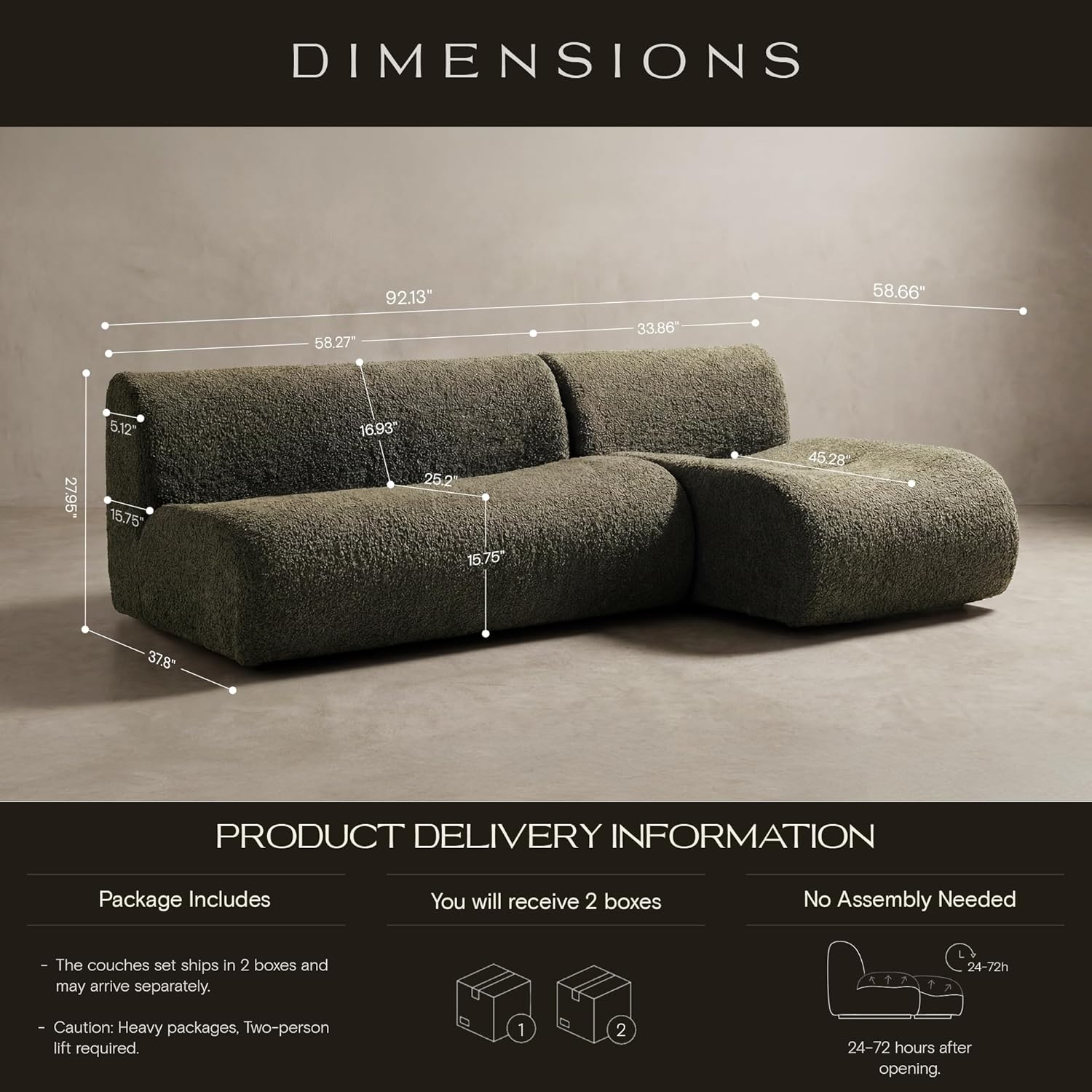 This sectional couch arrives fully assembled, so there’s no need for tools, hardware, or complicated instructions—just unpack, position, and relax. Due to its size and weight, we recommend careful handling when moving the piece into place. To maintain the boucle fabric’s texture and prevent matting, avoid placing heavy items directly on cushions and keep the surface free of sharp objects. Regular vacuuming on low suction and prompt spot cleaning of spills will help retain the sofa’s fresh look over time.