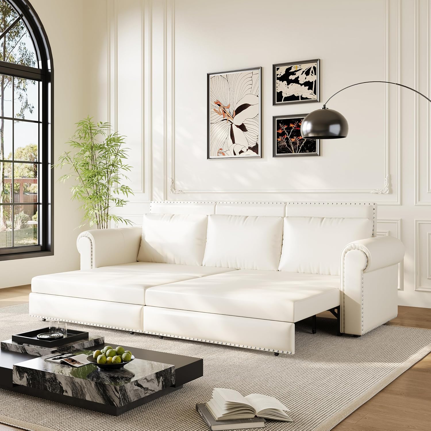 - Effortless 3-in-1 Conversion: With a user-friendly pull-and-lift mechanism, the sofa seamlessly transforms into a full king-size sleeper bed (approx. 78” x 75”), providing overnight guests with a comfortable and spacious sleeping surface without compromising daytime seating.