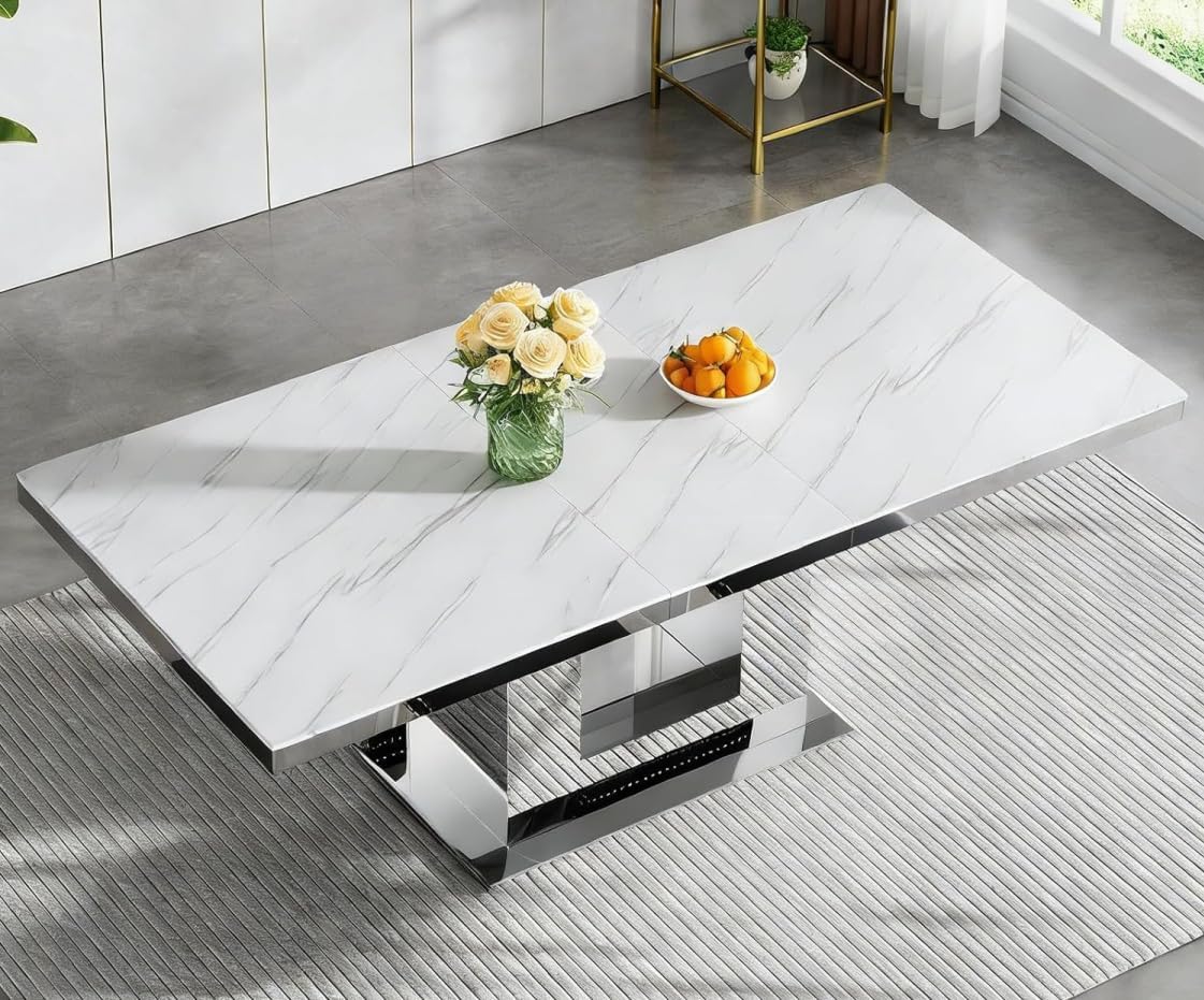 The table features a sleek white faux marble top that replicates the luxurious appearance of natural stone while offering superior durability and easier maintenance. Its mirrored pedestal base adds a striking visual element, reflecting light and enhancing the sense of openness in your dining area. Whether placed in a formal dining room, open-concept kitchen, or sunroom, this table serves as both a functional centerpiece and a statement of contemporary style.