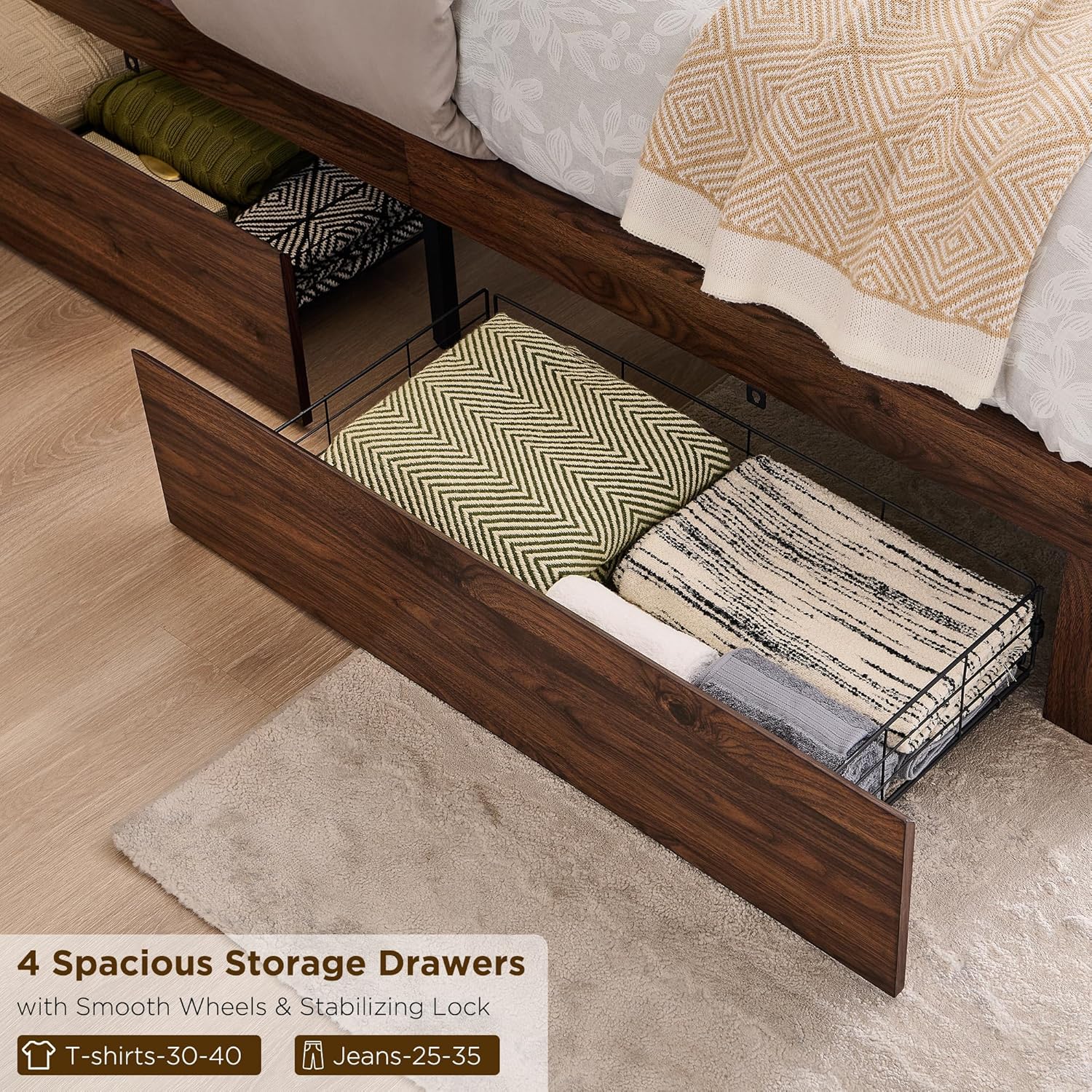 - 4 Spacious Storage Drawers: Each of the four fixed drawers is thoughtfully sized to hold bedding sets, seasonal garments, pillows, towels, or other bedroom necessities. Equipped with small wheels, they glide smoothly in and out, allowing easy access without jamming—perfect for tight spaces or renters who need extra storage without additional furniture.