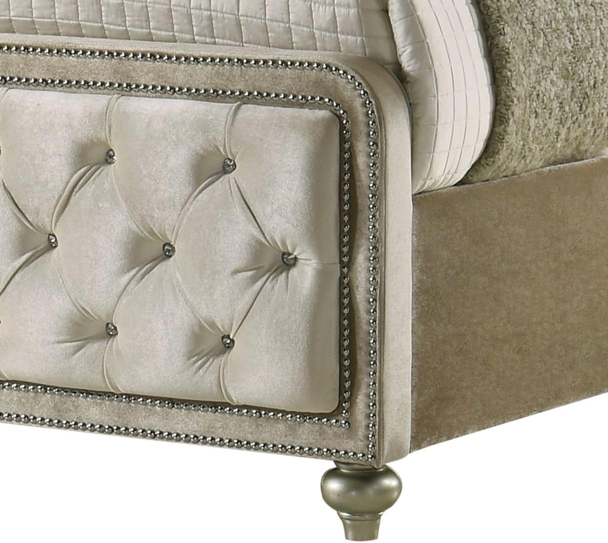 The Acme Lucienne Velvet Upholstered Eastern King Bed with LED in Beige transforms your bedroom into a sophisticated and stylish retreat. Designed with luxurious beige velvet upholstery, this bed blends elegance with modern comfort, making it ideal for homeowners who value both form and function. Its button-tufted design adds depth and texture, enhancing the overall visual appeal of any bedroom space. The built-in LED lighting offers a contemporary touch, providing ambient illumination without the need for additional fixtures. Whether placed in a master suite or a guest room, this bed makes a bold statement while offering a cozy and inviting sleeping environment.
