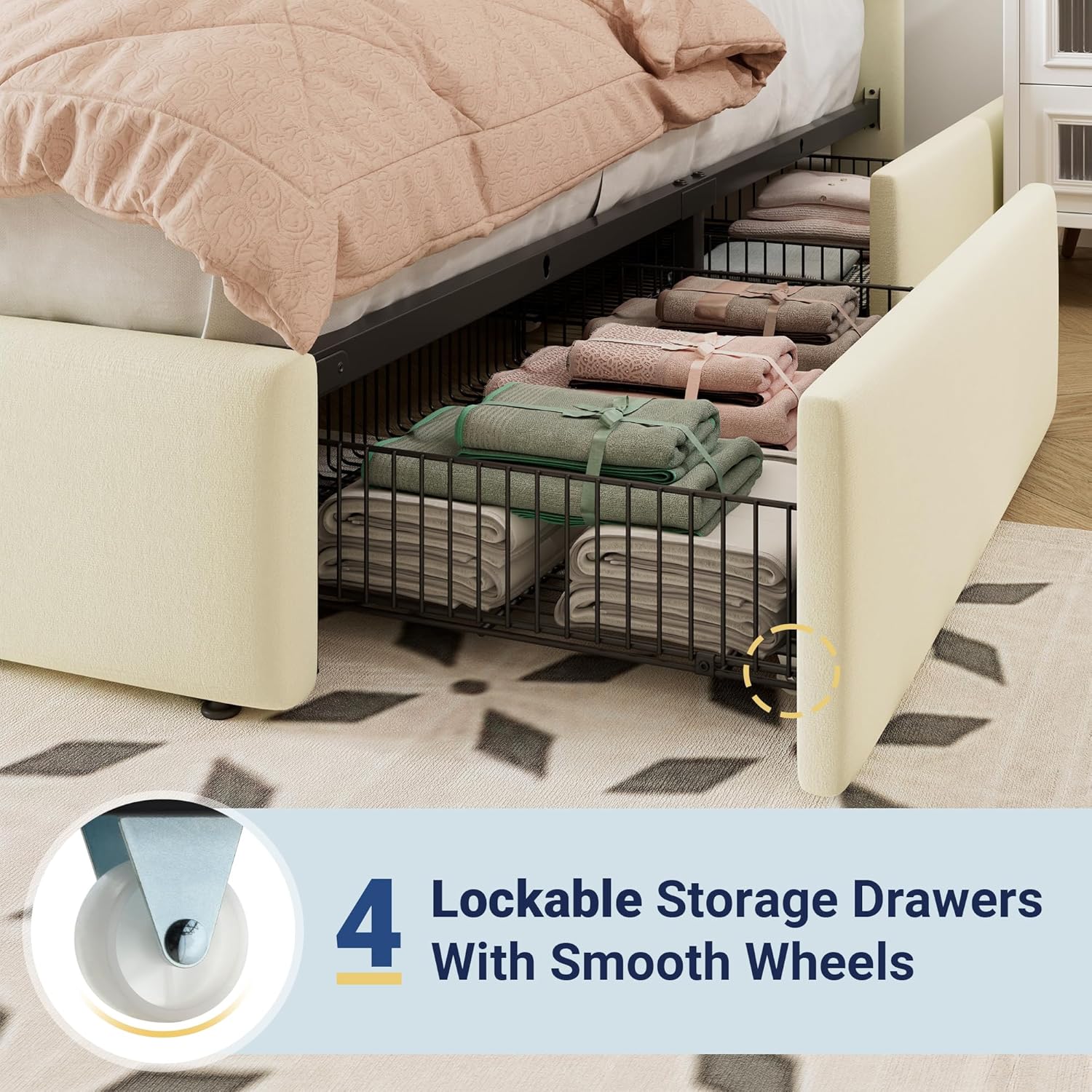 - Four Oversized Underbed Drawers – Each drawer is generously sized to store comforters, pillows, out-of-season clothing, or other essentials—perfect for small spaces where every inch counts. Their placement under the bed keeps belongings out of sight while remaining easily accessible.