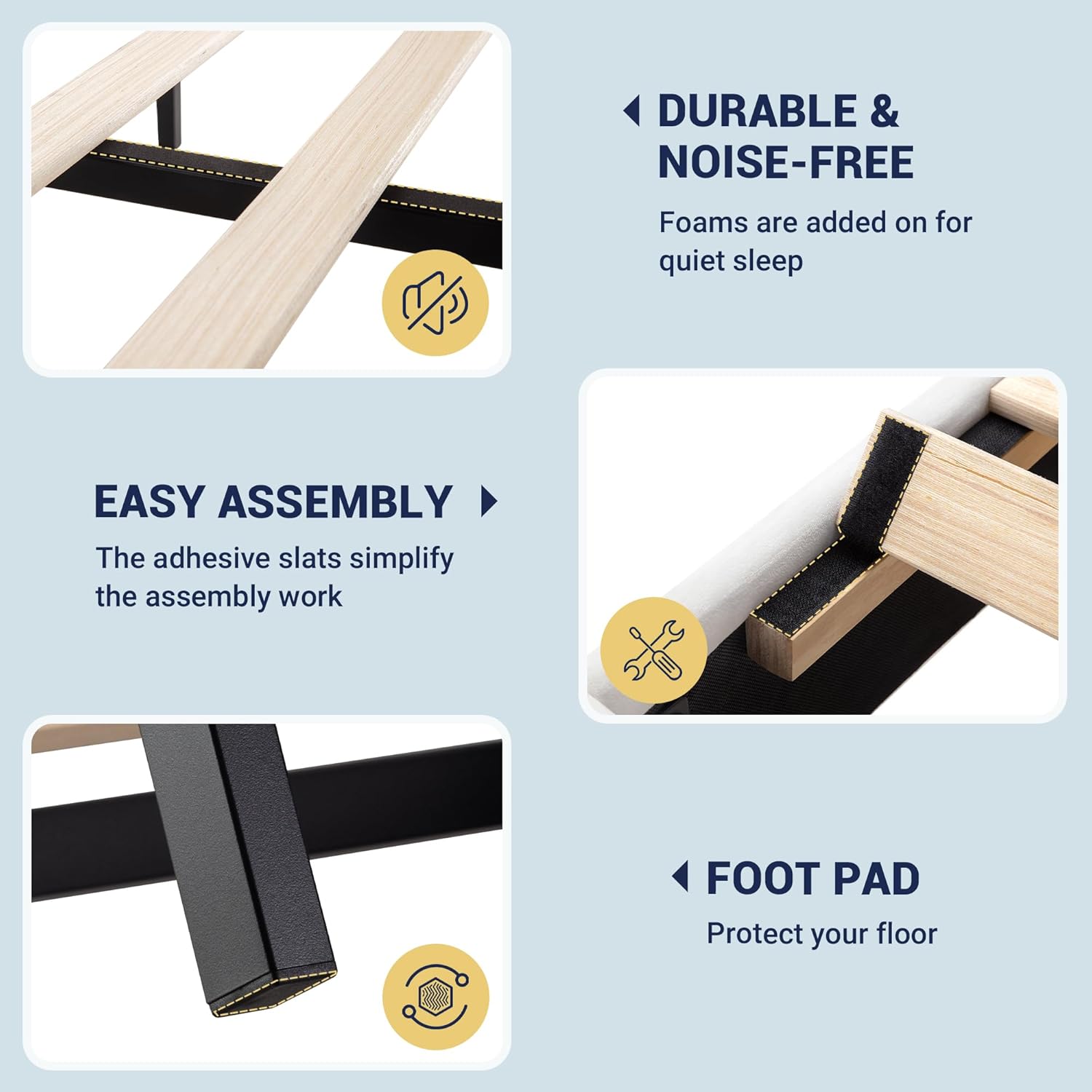 - Support Structure: Integrated wooden slats