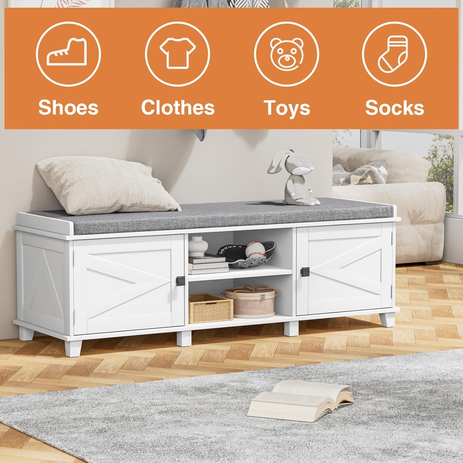 Anmytek Farmhouse White Shoe Storage Bench with Cushion Seat, Wood Storage Bench with Adjustable Shelves for Entryways, 47.2″ W x 15.7″ D x 15.7″ H, Entryway Shoe Rack Bench for Bedroom, Hallway