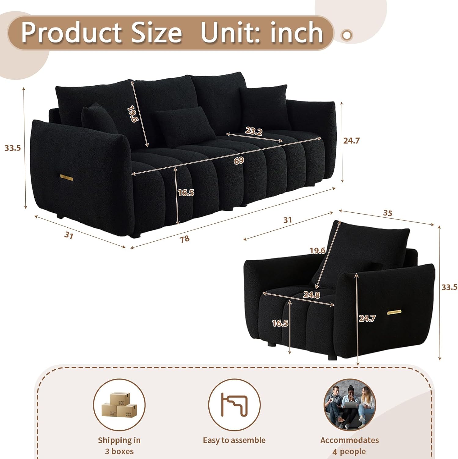 - 3-Seater Couch Dimensions: Overall: 31”D × 78”W × 33.5”H; Seat Size: 69″W × 23.2″D; Back Height: 20.5″; Arm Height: 24.7″; Seat Height: 20″