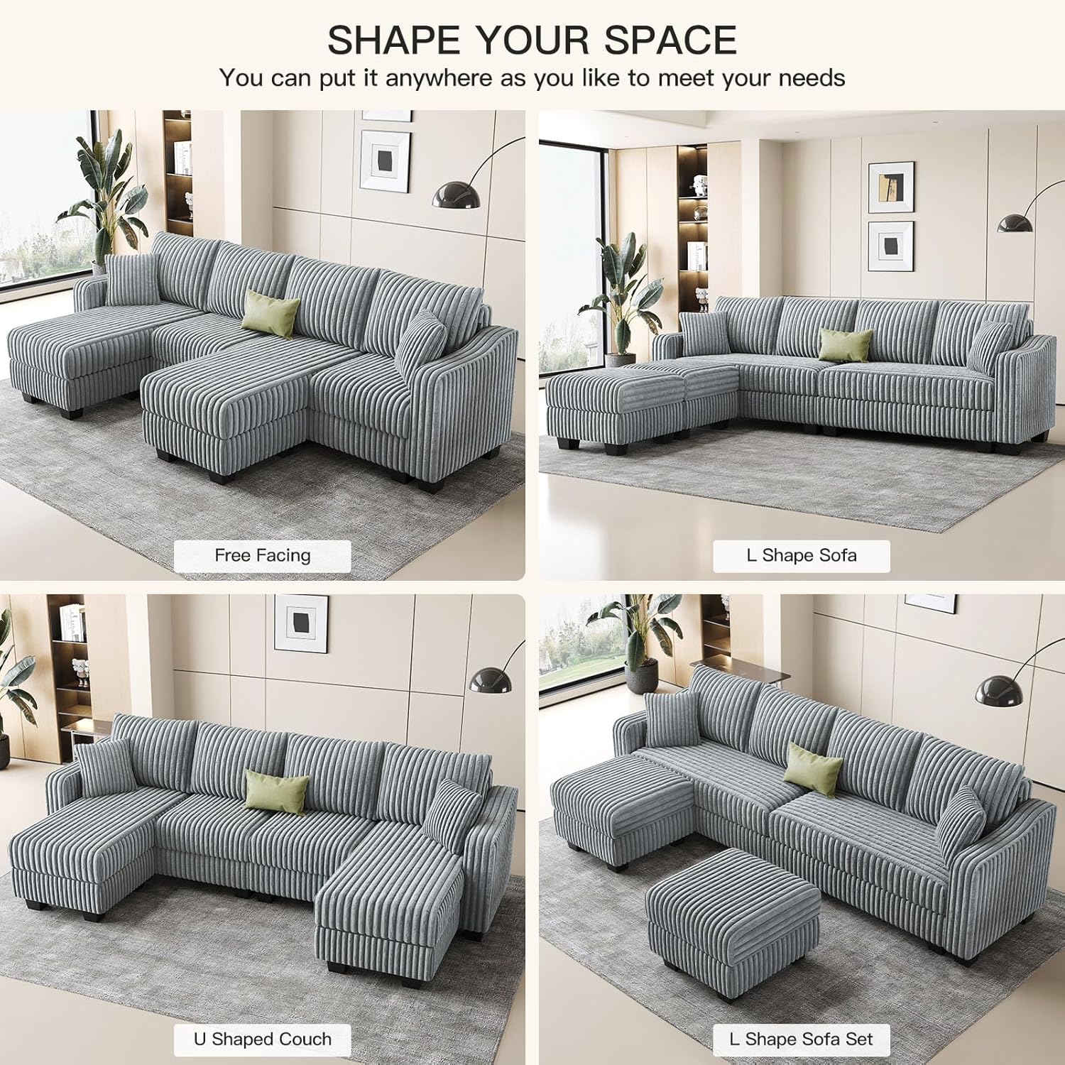 The Belffin U Shaped Couch brings a new level of comfort and style to your living room with its luxurious design and thoughtful functionality. Designed for modern homes that value both aesthetics and practicality, this sectional sofa combines plush corduroy fabric with a sturdy wooden frame to create a piece that’s as durable as it is inviting. Whether you’re hosting movie nights, lounging with family, or simply unwinding after a long day, the spacious seating and reversible chaises make every moment at home feel special.