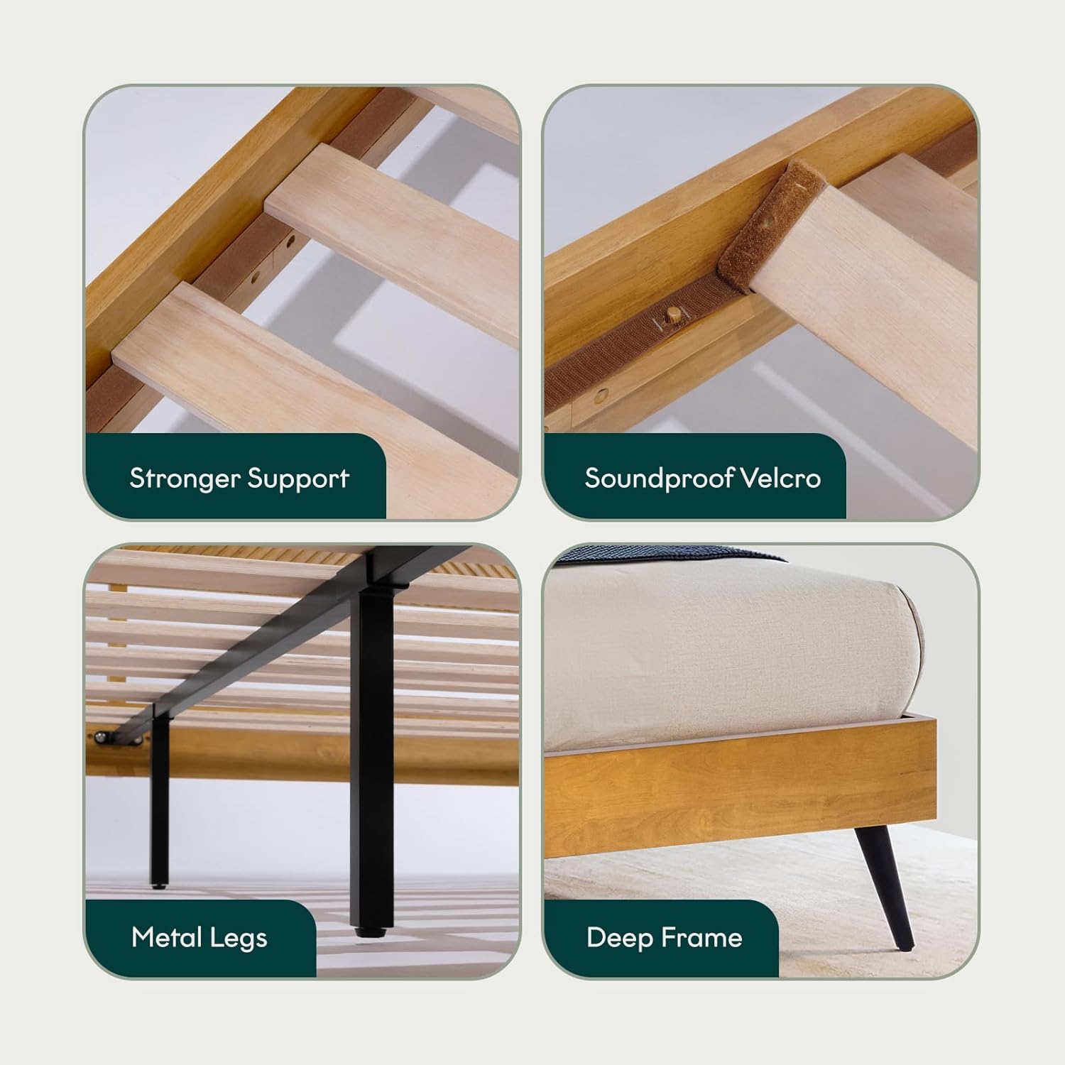 • Integrated Slat Support System: Heavy-duty wooden slats are precision-engineered to distribute weight evenly across the mattress surface, preventing sagging and extending mattress life.