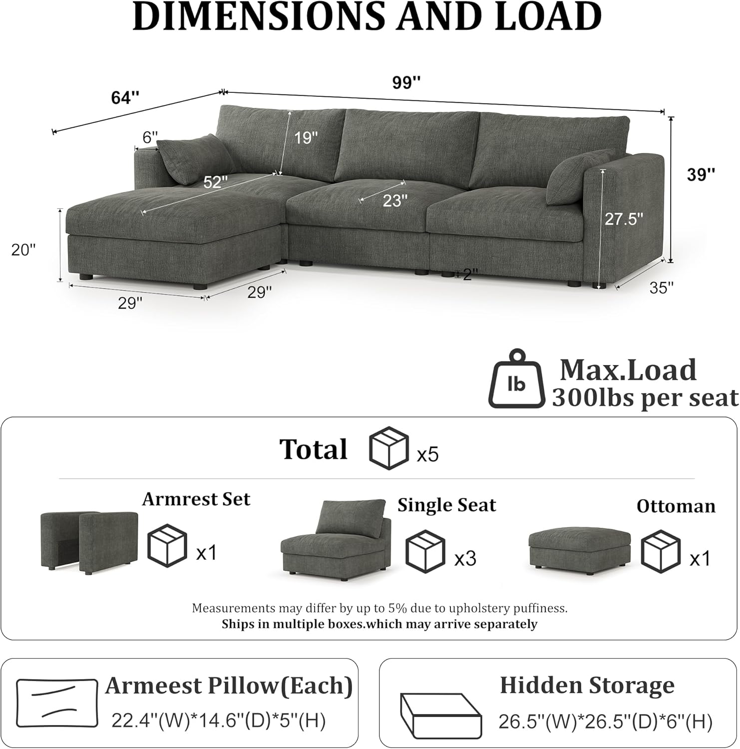 “meta_description”: “99” oversized L-shaped modular sofa with storage ottoman, deep 23″ seats, and cloud-like comfort in dark gray chenille-linen fabric. Perfect for living rooms.”