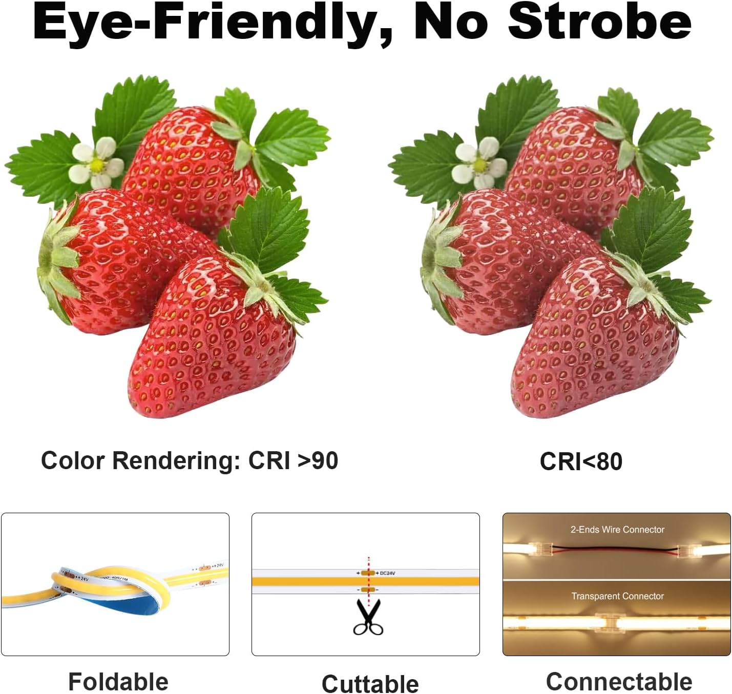 - Ultra-Bright & Uniform Lighting: With 5,760 LEDs (2,880 per 40ft roll), this COB strip eliminates dark zones and provides consistent, flicker-free brightness ideal for large or irregularly shaped spaces.