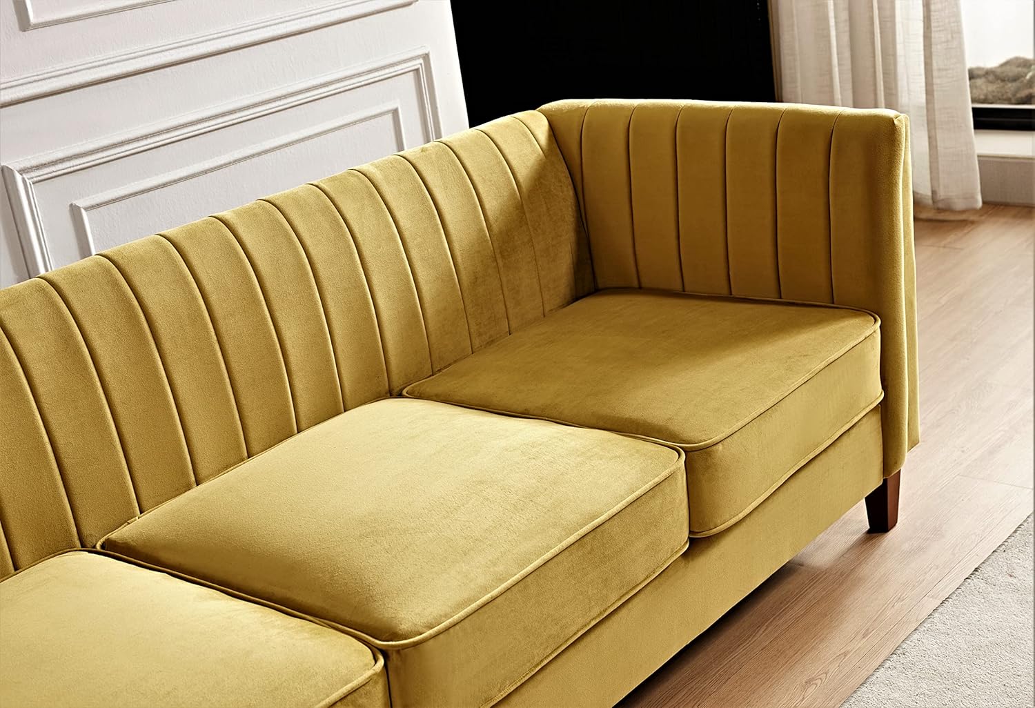 This modern luxury velvet couch redefines contemporary living room elegance with its sophisticated design and premium craftsmanship. Designed to serve as a stunning centerpiece, it blends timeless glamour with everyday functionality—perfect for homeowners who appreciate refined aesthetics without compromising on comfort. The sofa’s generous 83-inch width comfortably accommodates up to three people, making it ideal for family lounging, entertaining guests, or simply enjoying quiet moments at home. Its bold mustard yellow upholstery adds a vibrant yet warm accent to any space, effortlessly elevating the visual appeal of living rooms, dens, or open-concept interiors.